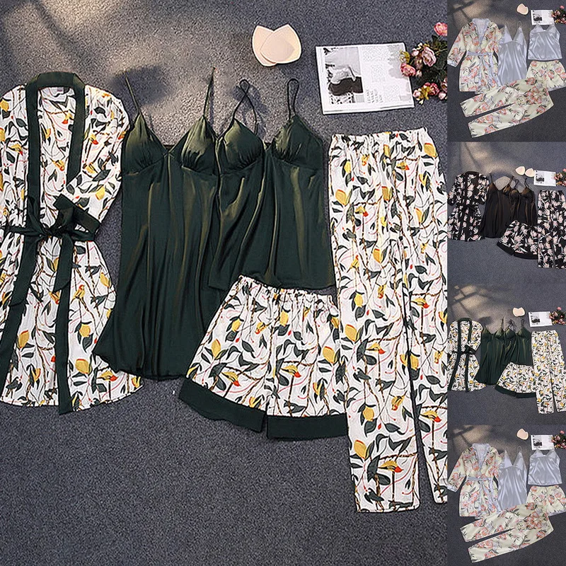 Oeak женские пижамы шелковые цветочные общей печати 5 шт. пижамный ...