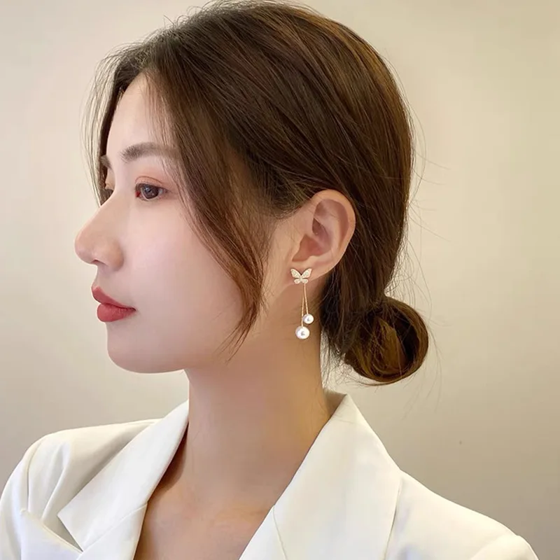 Серьги-гвоздики с бабочками и кисточками, роскошные кристаллы, длинный жемчуг, подвеска, очаровательные корейские ювелирные изделия 2022, оптовая продажа, прекрасные аксессуары Kpop