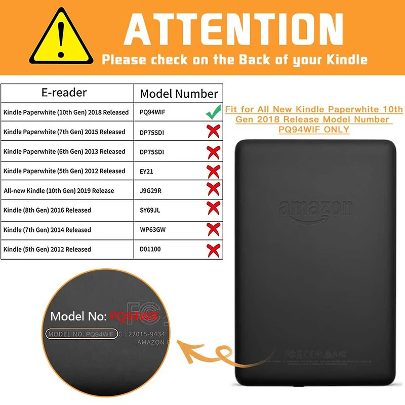 Специально разработан для Amazon Kindle Paperwhite 10-го поколения 2018 выпущен 【номер модели PQ94WIF (напечатан на задней панели вашего kindle); Память 8 ГБ или 32 ГБ; Префикс серийного номера: G000PP,G000102,G000T2, g000T1, G000T6,G000T3 (проверено на вашем kindle устройстве) 】. Не подходит для других моделей Kindle! Если у вас есть Kindle Basic 10th Gen 【номер модели J9G29R (напечатан на задней панели вашего kindle); Память 4 Гб 】