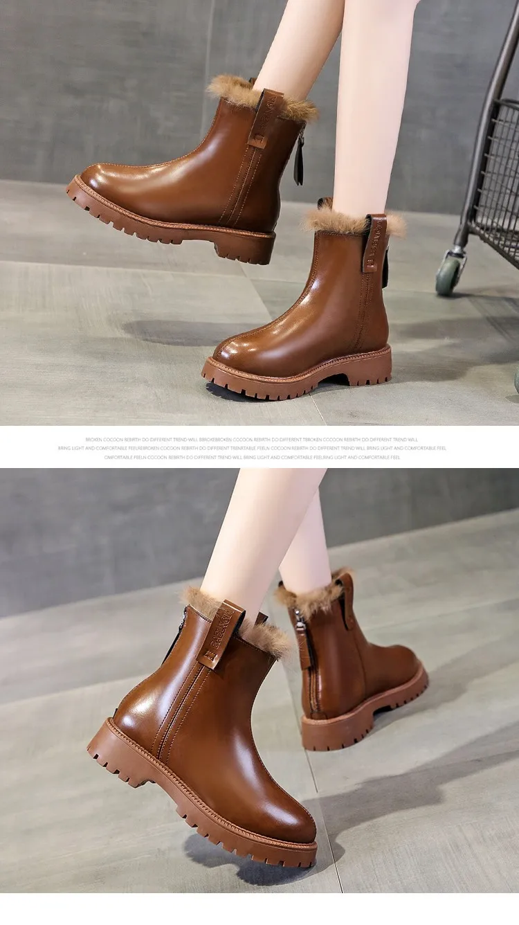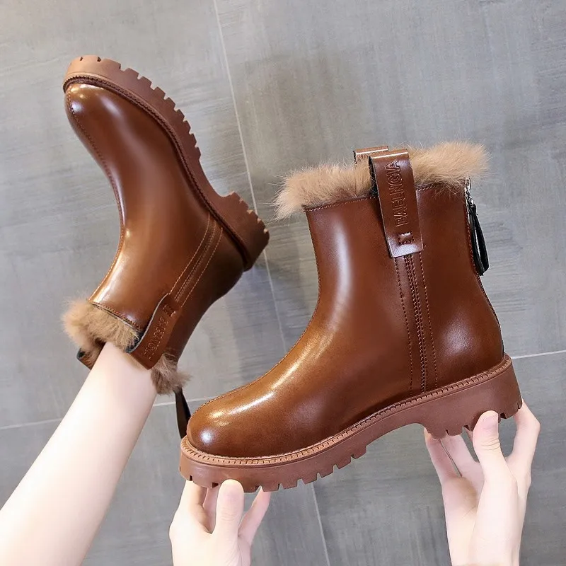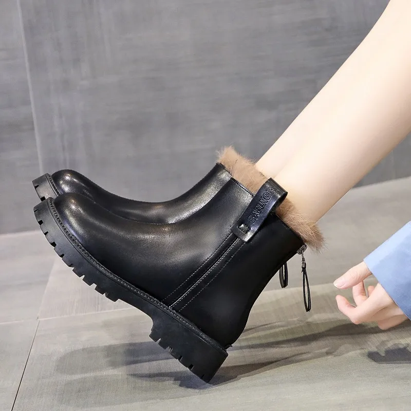 Женские ботинки, зимние плюшевые теплые короткие Туфли-трубки, модная обувь, женские ботильоны на толстой подошве и молнии, кожаные ботинки