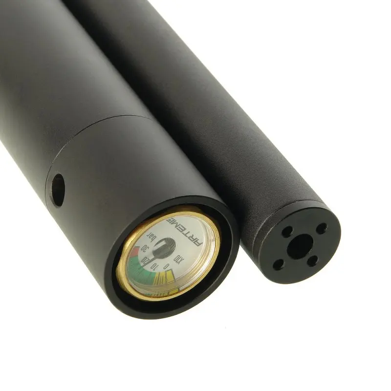 Съемный металлический резервуар для закачивания воздуха рассчитан на рабочее давление 70–250 bar и предельное – 300 bar. Одной закачки на 250 bar хватает на 250 выстрелов. Контролировать давление позволяет манометр с цветной шкалой. В комплект входит латунный штуцер (переходник) для соединения с насосом или баллоном.