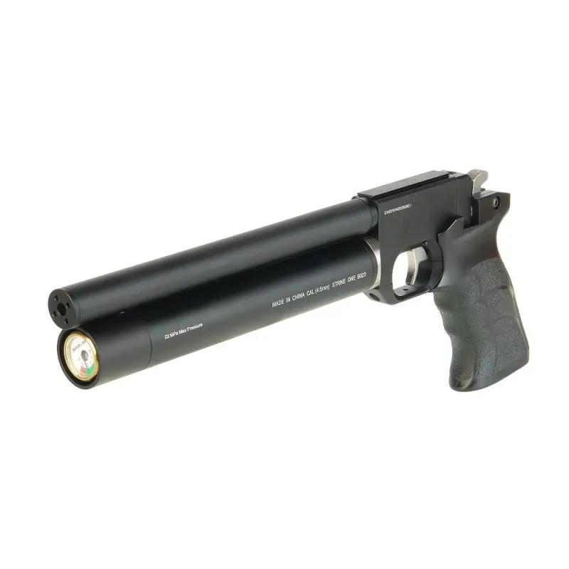 STRIKE ONE «В023» – пневматический однозарядный пистолет с предварительной накачкой (PCP) для развлекательной стрельбы и отработки стрелковых навыков. Пулька вставляется с казенной стороны ствола и запирается поворотом бокового затвора против часовой стрелки. Пистолет отличается экономным расходом воздуха и минимальной отдачей.