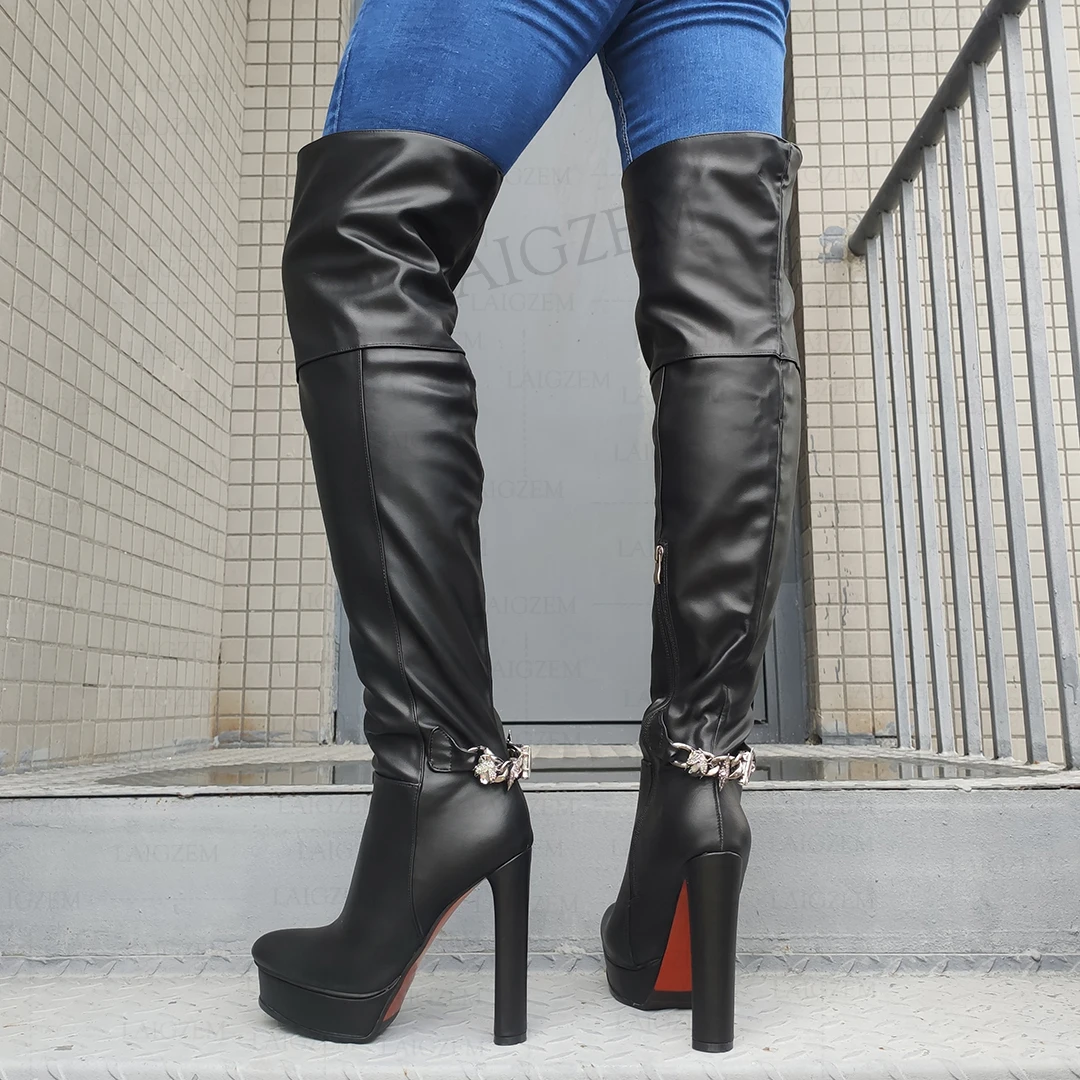 LAIGZEM/женские ботфорты выше колена; Сапоги на толстом каблуке с круглым носком и боковой молнией; Высокие сапоги из искусственной кожи; Zapatos; Большие размеры 41, 43, 44