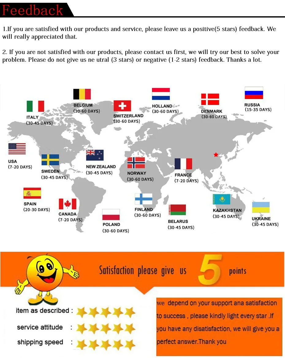 Оплата и доставкаМеждународные покупатели, пожалуйста, обратите внимание:Импортные пошлины, налоги и сборы не включены в цену товара или стоимость доставки. Эти расходы являются обязанностью покупателя.Пожалуйста, свяжитесь с таможней вашей страны, чтобы определить, какие дополнительные расходы будут до торгов/покупки.Доставка:Товар будет отправлен только на Escrow адрес доставки покупателя, поэтому, пожалуйста, подтвердите Ваш доступный адрес на Escrow перед оплатой.Но иногда международная доставка сильно зависит от курьерской компании и местных таможенных пошлин. Если вы не получили товар вовремя, свяжитесь с нами немедленно, чтобы мы могли оказать помощь. Спасибо за понимание.Способ доставки:Товары будут отправлены AliExpress стандартной доставкой, Почта Китая. Это займет 15-60 рабочих дней с даты отгрузки.Товары будут отправлены USPS в США, абсолютно безопасно! Каждая посылка имеет номер отслеживания. Это займет 7-12 рабочих дней с даты отгрузки.Также мы можем произвести поставку службами экспресс-доставки DHL, UPS, EMS. В этом случае вам будет необходимо доплатить соответствующую сумму денег за срочную доставку. Если вам нужна служба экспресс-доставки, пожалуйста, свяжитесь с нами перед заказом (телефон необходим для международной экспресс-доставки, если вам нужна служба экспресс-доставки, пожалуйста, обратите внимание на ваш телефон при оплате.)Время доставки:Все товары будут отправлены вам в течение 3 рабочих дней (в будние дни-с понедельника по пятницу) оплата будет очищена на стороне продавцаРасчетное время доставкиМеждународная посылка занимает около 15-60 дней для доставки в пункт назначения; Через почтовое отделение в прошлом статистическом отчете о доставке, ниже приведена таблица времени доставки для некоторых стран, только для справки покупателя.Escrow является нашим предпочтительным способом оплаты, мы также принимаем различные платежи, как показано ниже: Western Union,VISA,QIWI,MoneyGram,MasterCard.Если есть какие-либо проблемы с оплатой, просим не стесняться и связаться с нами.Мы принимаем оплату через PayPal. Просим убедиться, что до подачи заявки ваш счет PayPal был действующим/был подтвержденВсе оплаты через PayPal необходимо подтверждать (адрес доставки и адрес оплаты должны совпадать). Оплата производится в течение 7 дней со дня окончания аукционаЕсли через 14 дней после аукциона полная сумма оплаты не поступила автоматически возникает спор по неуплате.Возврат принимается в течение 14 дней после даты получения товара покупателем. (Исключая утерянные повреждения или неправильное использование).100% гарантия возврата денег!Все товары перед поставкой проходят 100% проверку. Если товар поврежден при почтовой пересылке, Покупатель имеет до 14 дней с даты получения дляОбмена товара на новый. Все транспортные расходы за возвращенный товар оплачивает Покупатель, просим связаться с нами и сообщить обратный адрес.Мы оставим положительную обратную связь для вас после получения оплаты. Ваши отзывы очень важны для нас, положительные отзывы и 5 баллов DSR высоко ценятся.Перед тем как оставить негативный отзыв, оценку в 1 или 2 балла в ДРП, а также открыть какой-либо спор на сайтах PayPal и Ebay, пожалуйста, дайте нам возможность решить ваши проблемы, и мы сделаем все возможное, чтобы удовлетворить ваши потребности.Если у вас возникнут какие-либо вопросы, пожалуйста, 