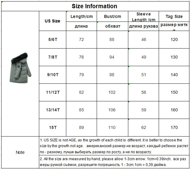 Дружеские советы:(1) Размер измеряется вручную, поэтому учитывайте, пожалуйста, погрешность в 1–3 см. (1 дюйм = 2,54 см)(2) Если под ваши замеры подходят два размера, мы рекомендуем выбрать больший размер.(3) цвет фотографии может немного отличаться от фактического товара из-за цветопередачи разных мониторов.Внимание plz:Если ваш ребенок пухленький, рекомендуем выбрать больший размер, спасибо.Просим перепроверять размеры детей, рост и полноту по размерной таблице перед покупкой/подачей заявки. Спасибо.Таблица размеров (см)