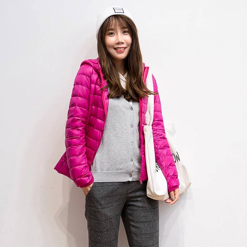 Пуховик женский ультралегкий, тонкий пуховик с капюшоном на белом у...