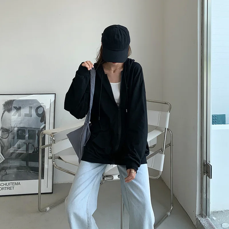 Женская Толстовка свободного покроя, тонкая Солнцезащитная куртка с длинным рукавом и капюшоном, Однотонная рубашка в стиле ретро, топ для студенток, толстовка