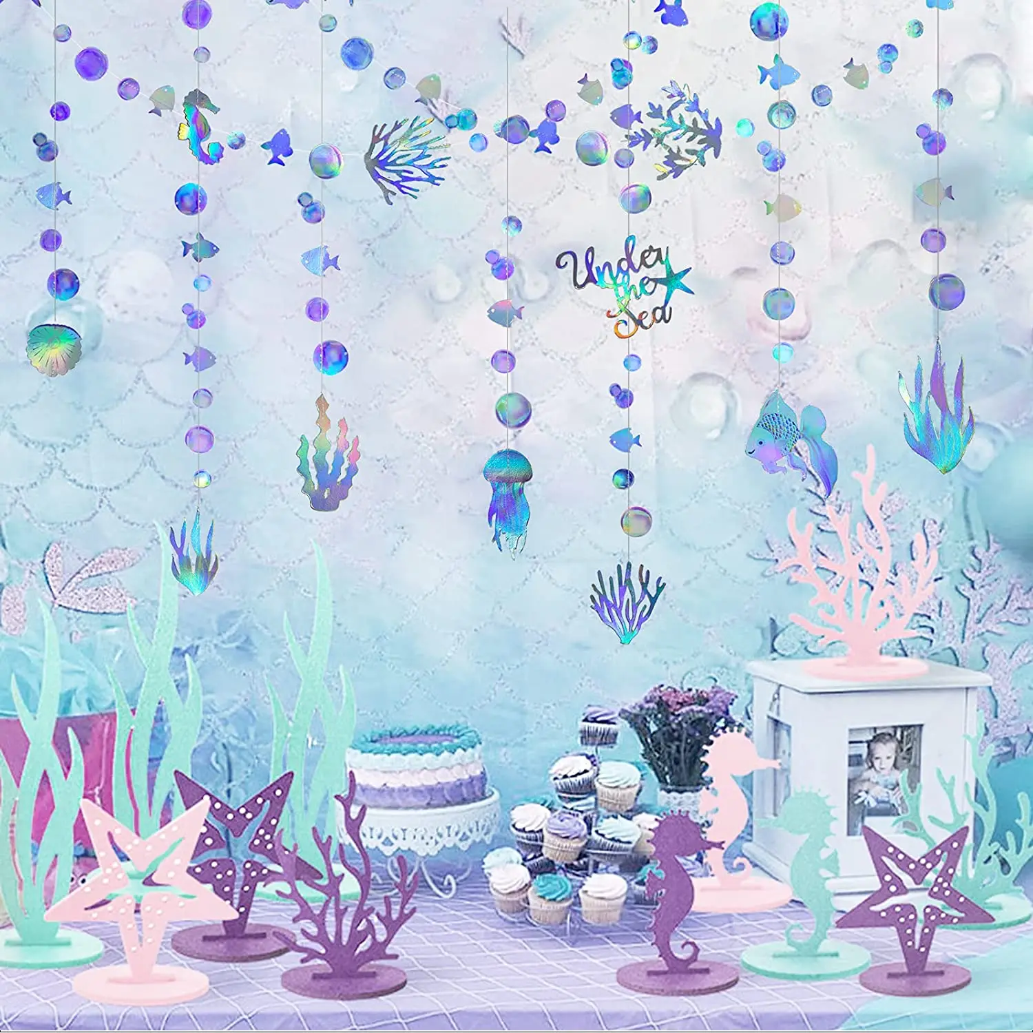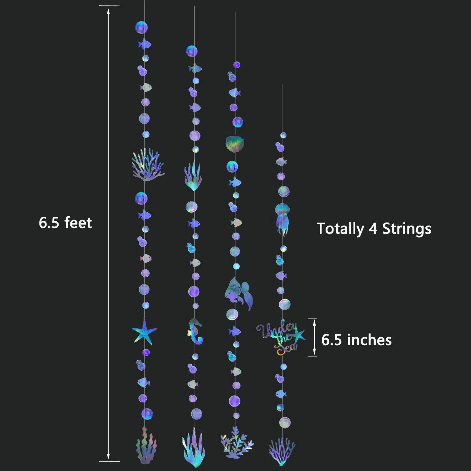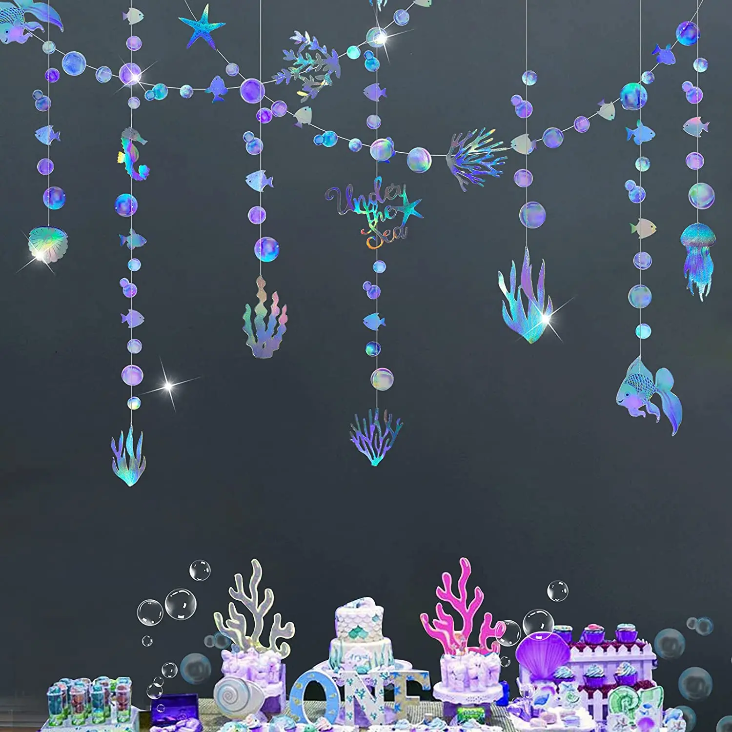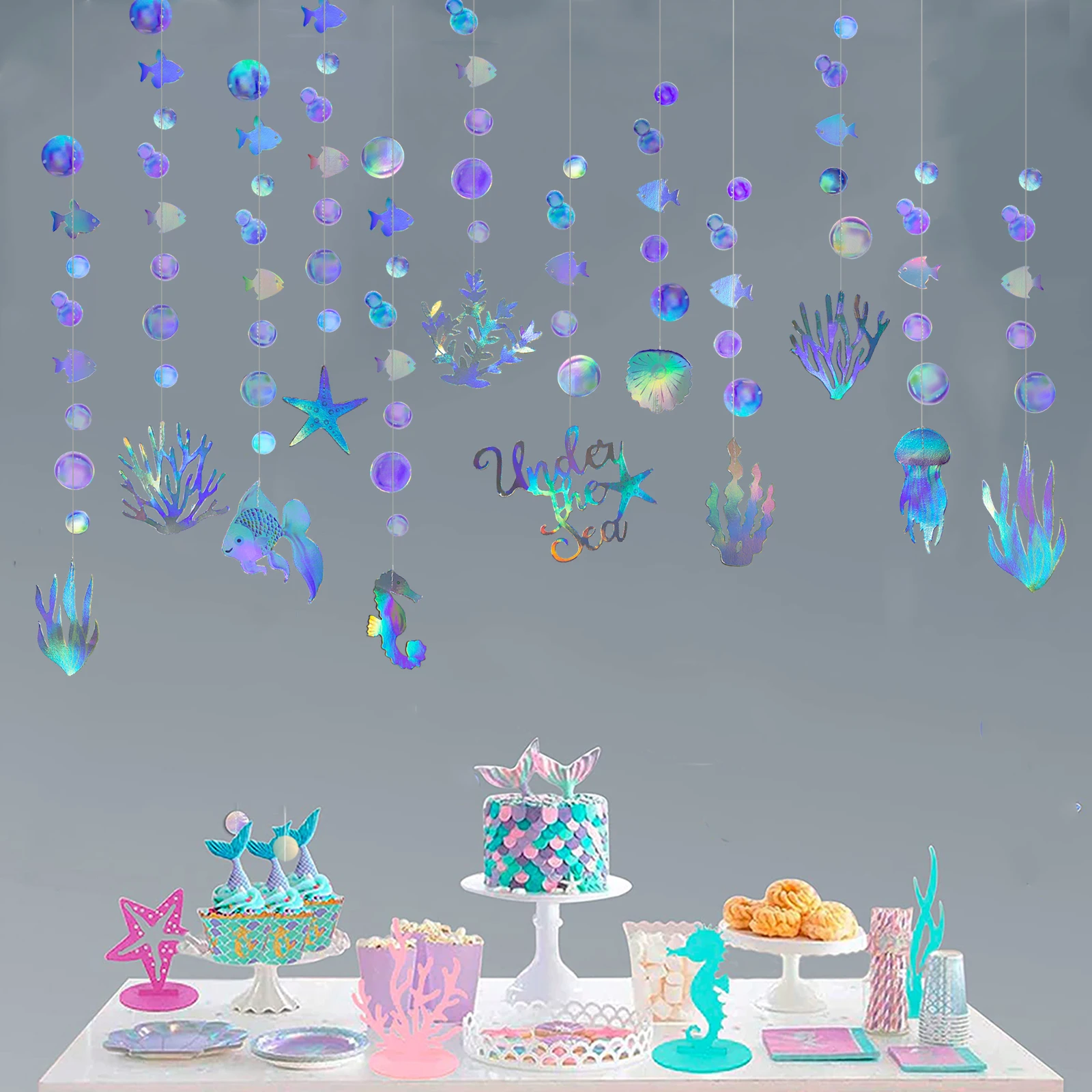 Уникальный дизайн:Эти голографические гирлянды-яркие украшения, свисающие в воздухе. Они предназначены для того, чтобы принести жизненную силу и ритм океанского мира для вашего дома и вечеринок и являются отличными декорациями для любого лета, океана, моря, под морем тематические настройки.