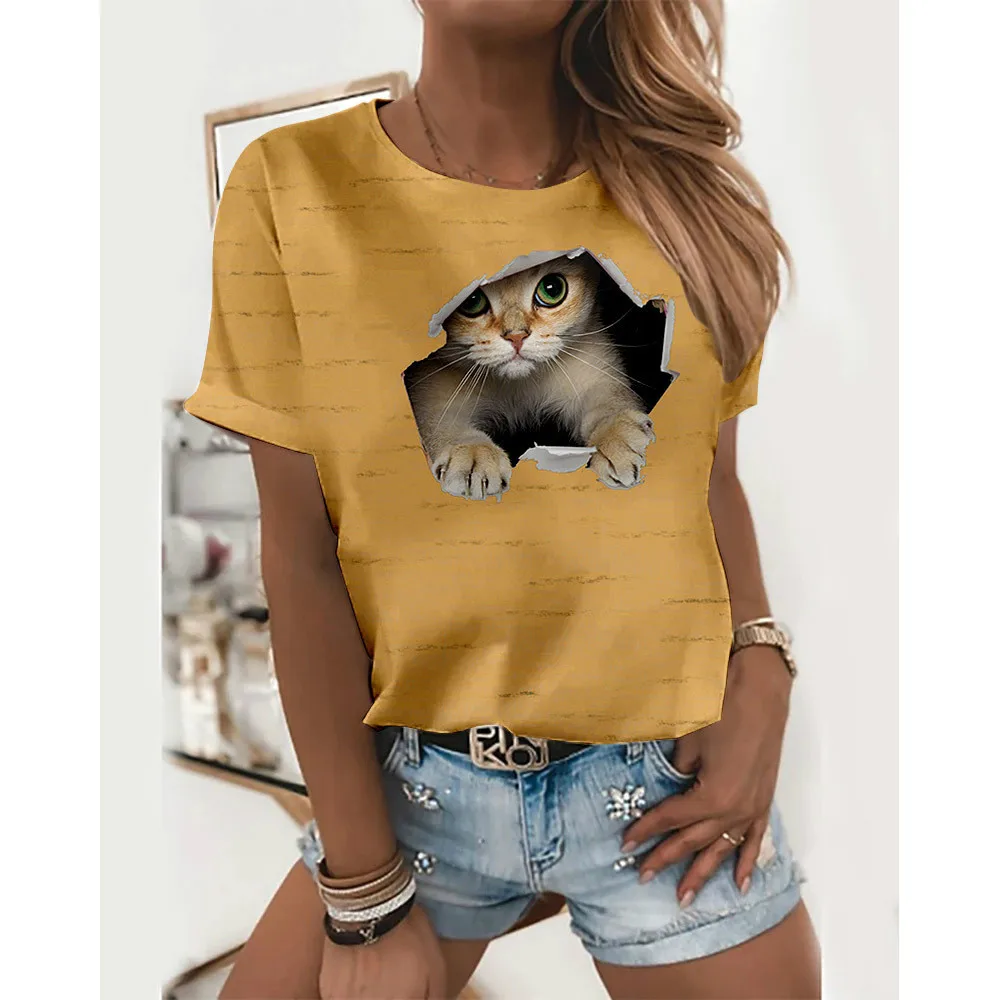 Женская футболка с круглым вырезом, повседневный пуловер с коротким рукавом, принтом кошек и 3D принтом, лето 2021