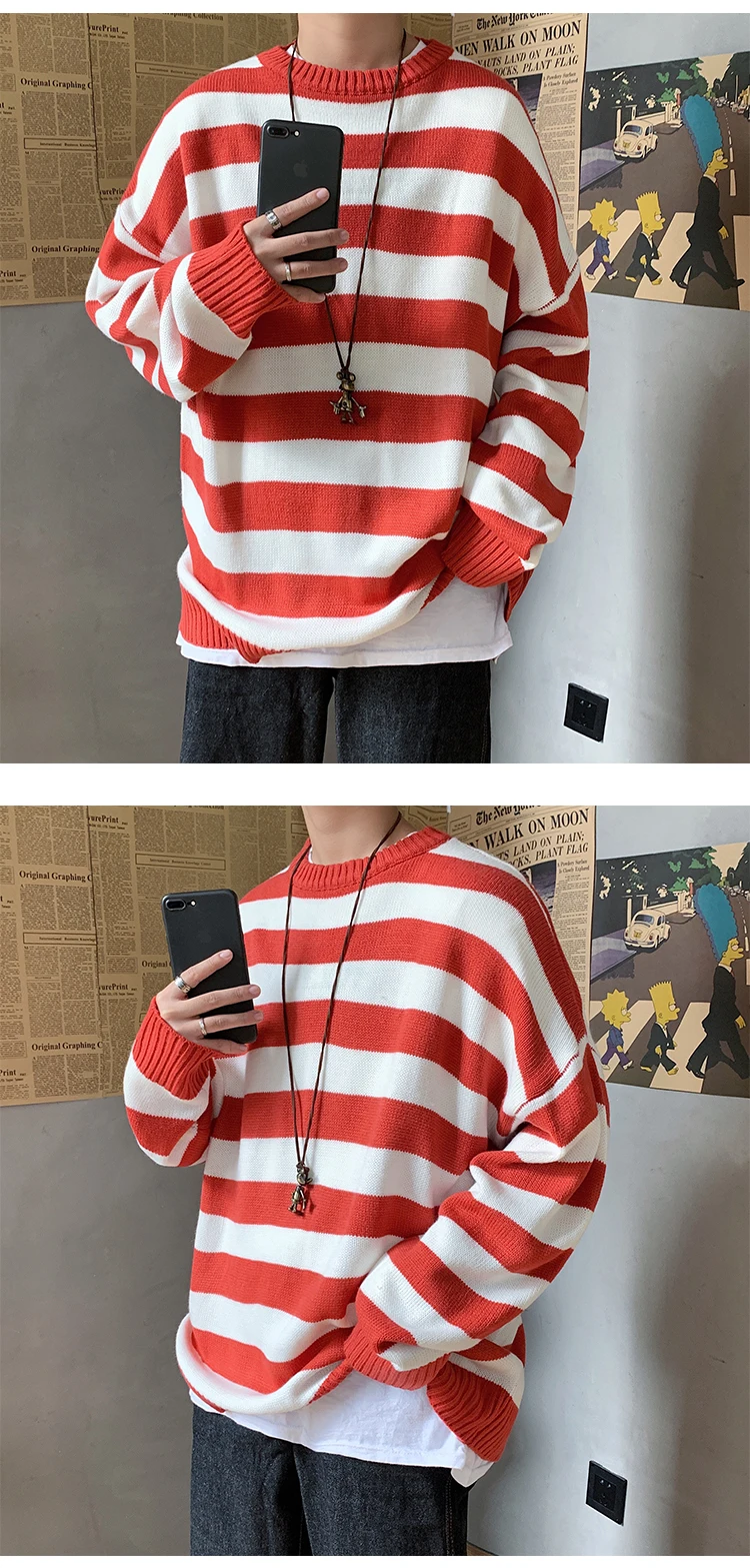 Мужской повседневный вязаный свитер в полоску, корейский пуловер ов...