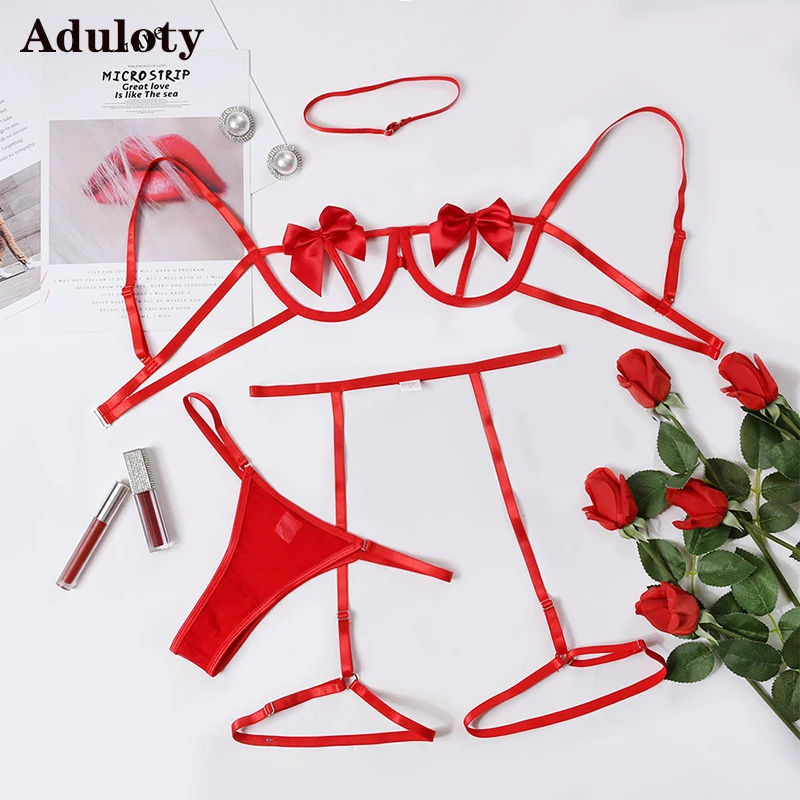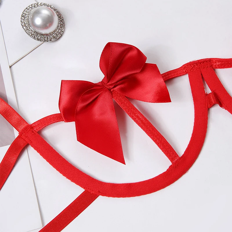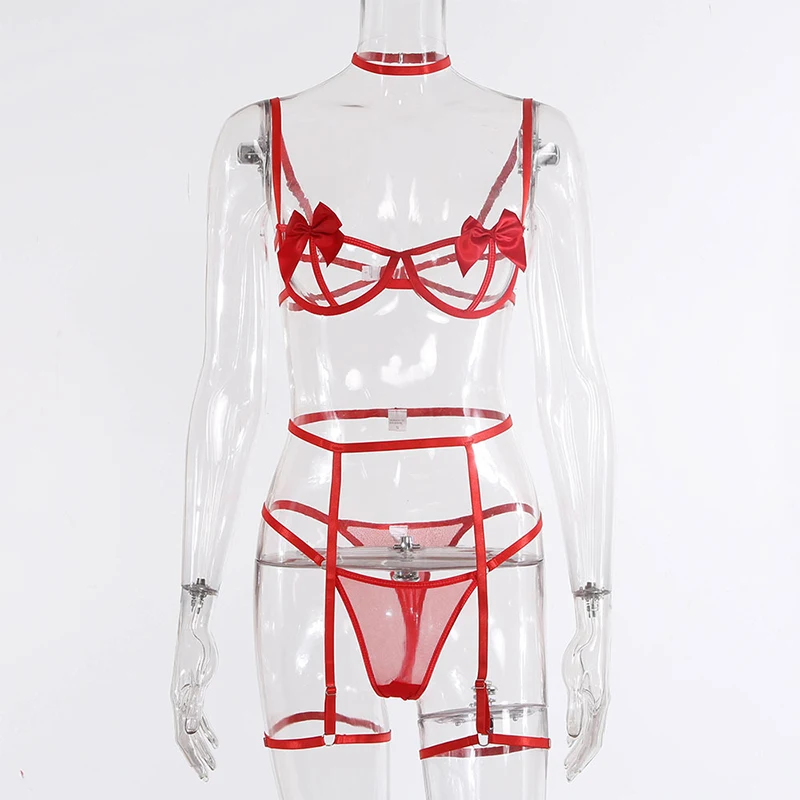 Сексуальное кольцо на шею, бант, сексуальная девушка с вырезами, прозрачные подвязки, стринги, комплект из трех предметов, Эротическое нижнее белье, нижнее белье