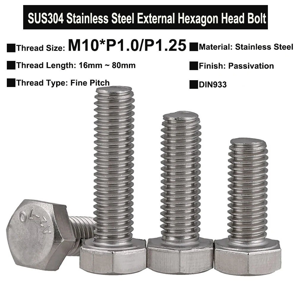 5 шт. M10xP1.0P1.25 SUS304 наружный болт с шестигранной головкой из нержавеющей стали, винт с мелким шагом, резьба длиной 16 мм 80 мм