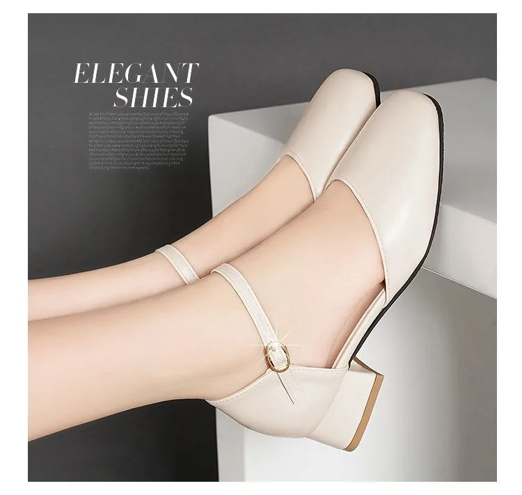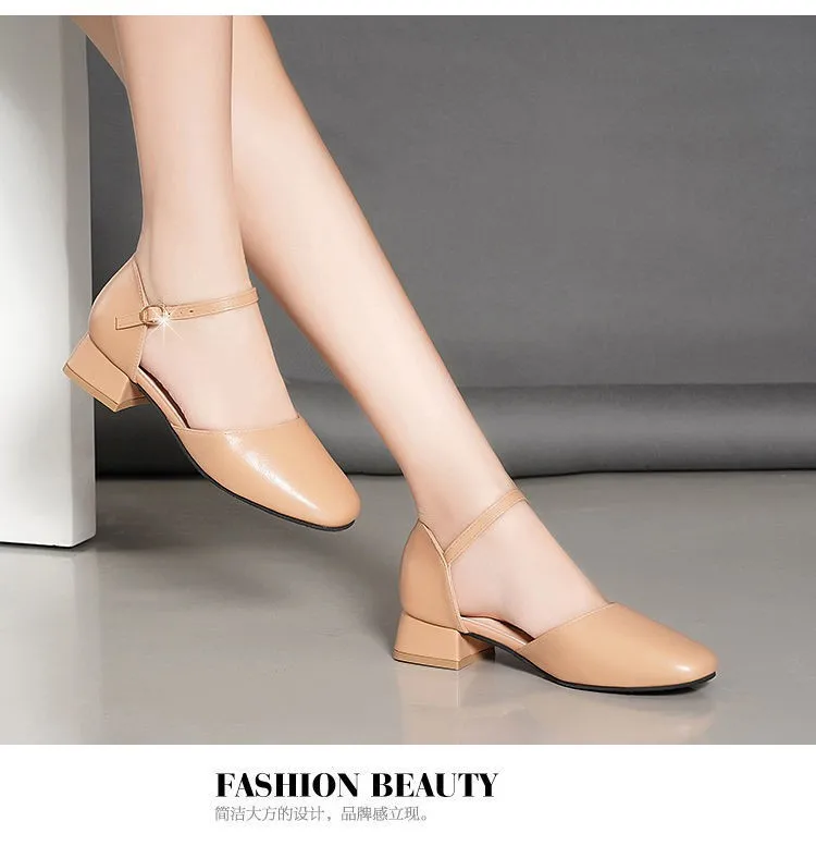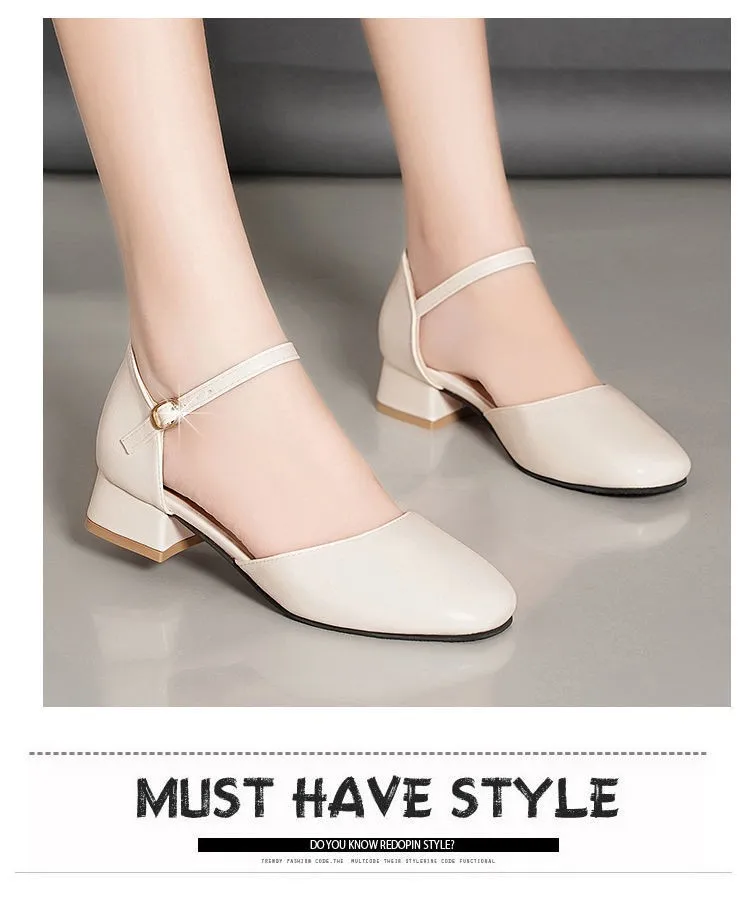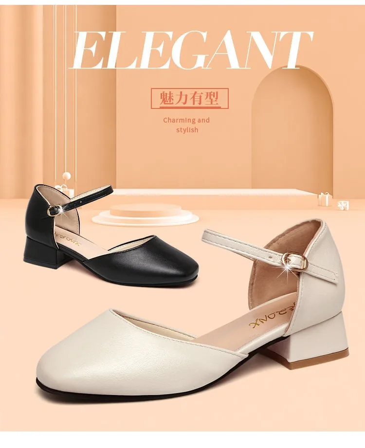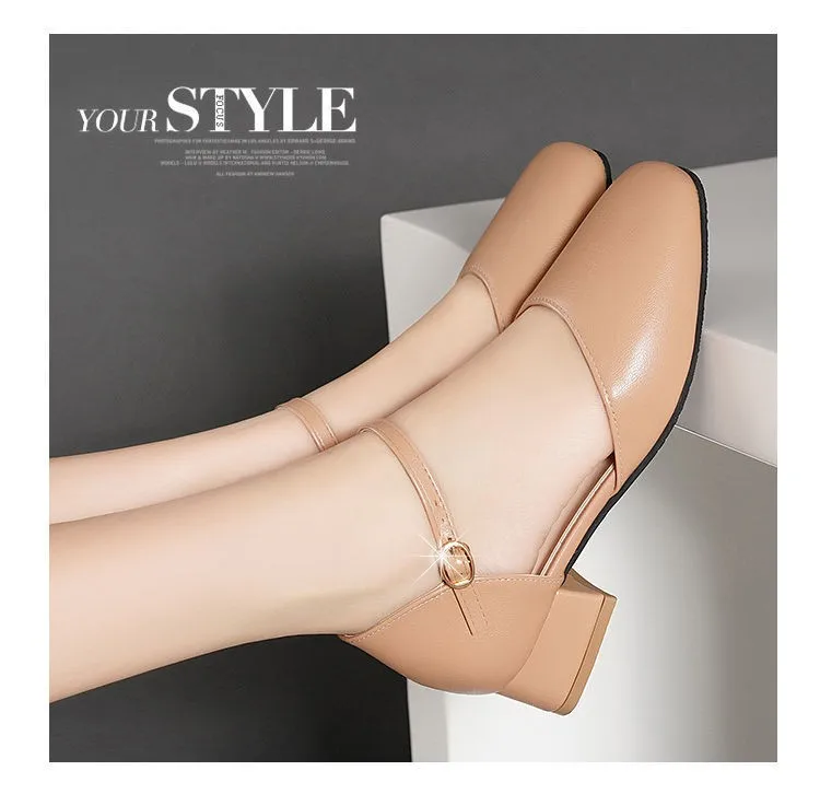 Женские кожаные туфли на среднем каблуке, с круглым носком, с низкой пряжкой, новинка весны и осени 2021