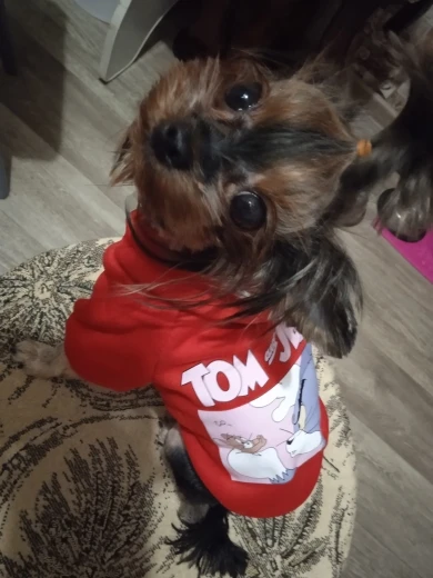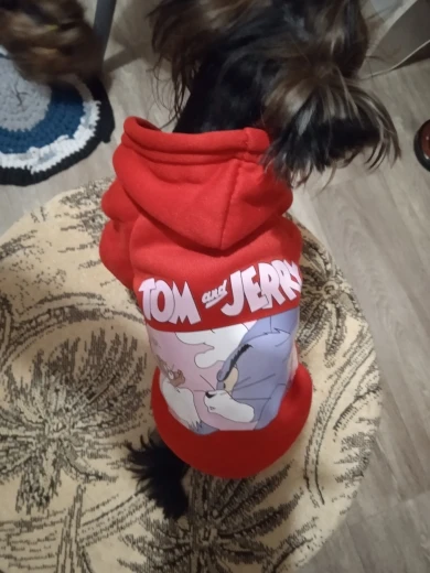 Горловина узковатая для головы собаки, но длина, обхват груди подходит. Материал приятный, принт яркий