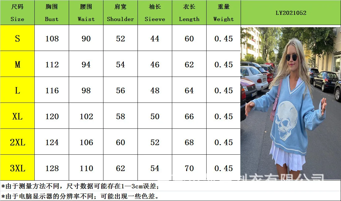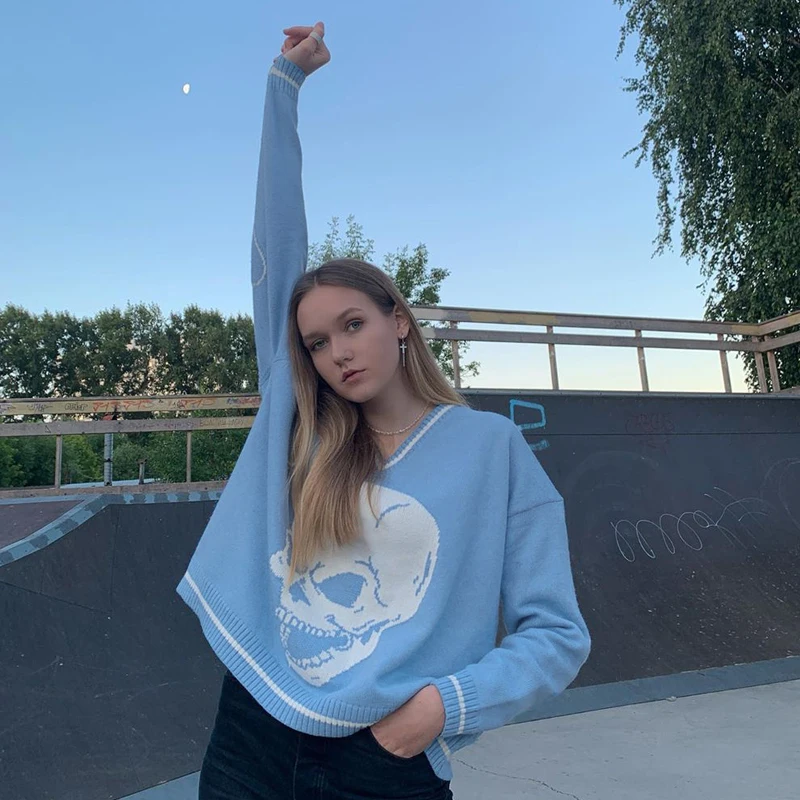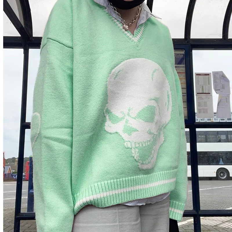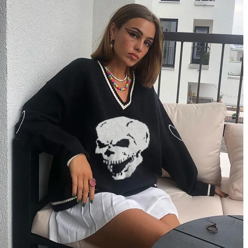 Женский свитер с V-образным вырезом и принтом, Свободный Повседневный вязаный уличный топ в стиле ретро с рисунком черепа, шерстяной жилет на осень и зиму