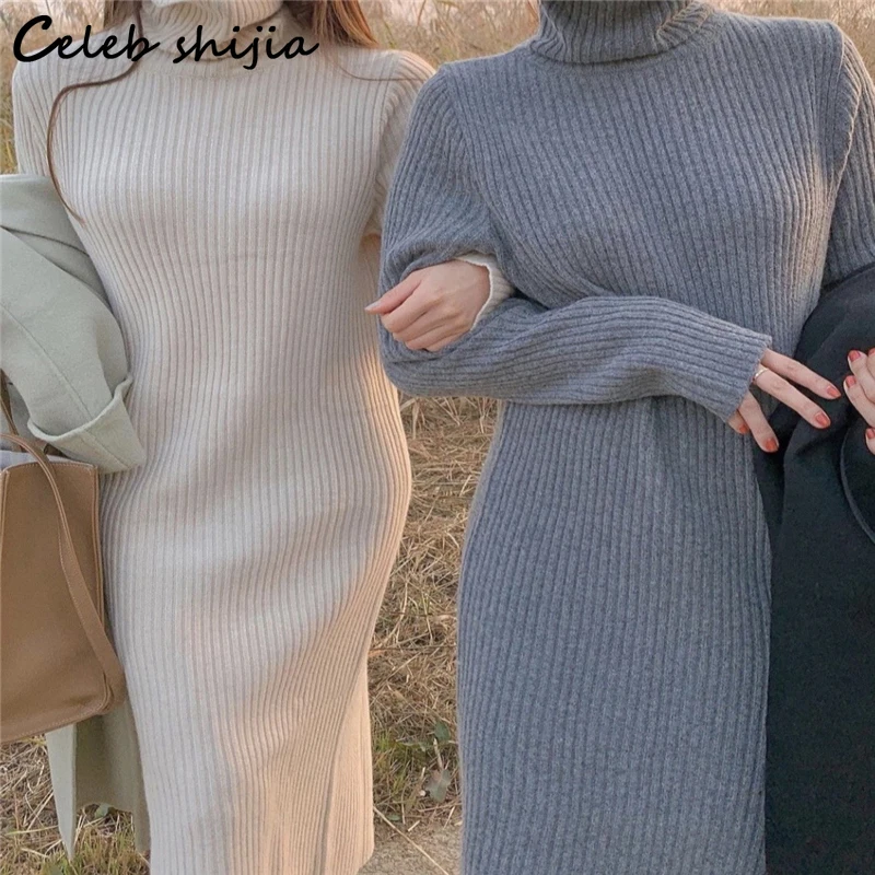 Плотное вязаное платье с высоким воротником, серое шерстяное длинное платье, женские зимние корейские элегантные свободные вязаные Макси-платья, Женский уличный свитер