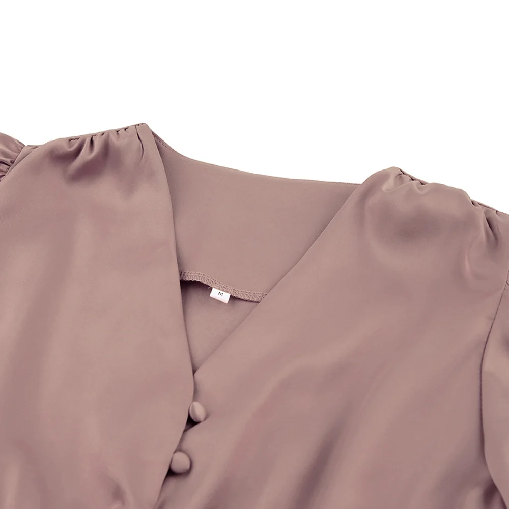 Женское атласное платье-рубашка с длинным рукавом и V-образным вырезом