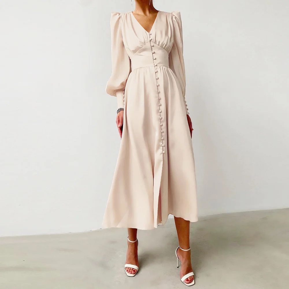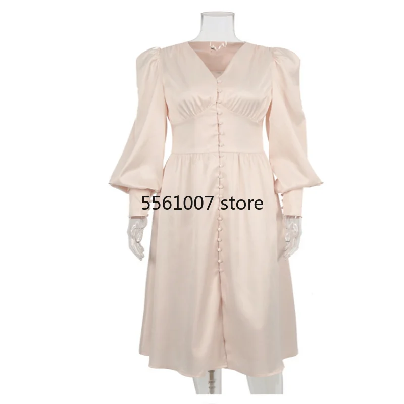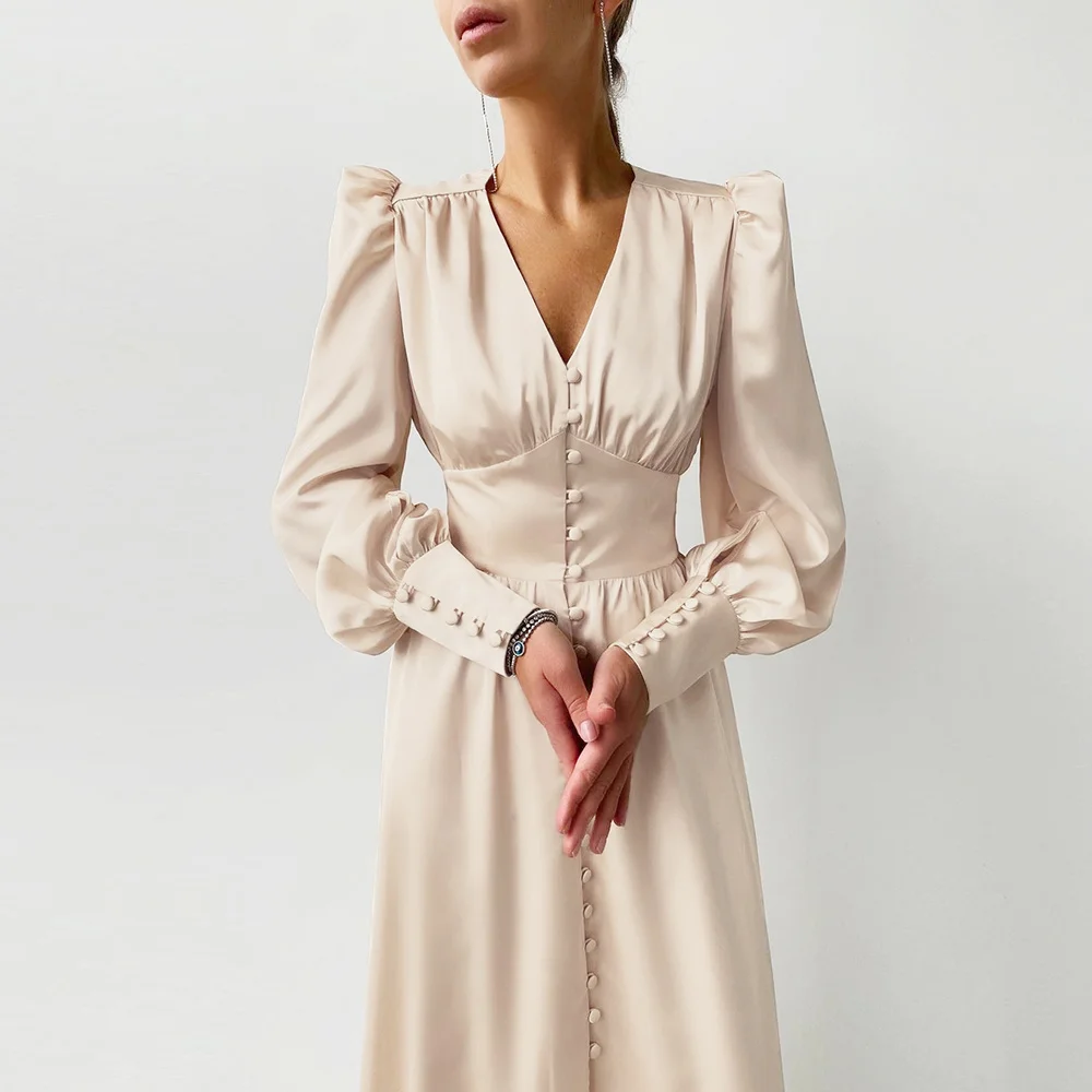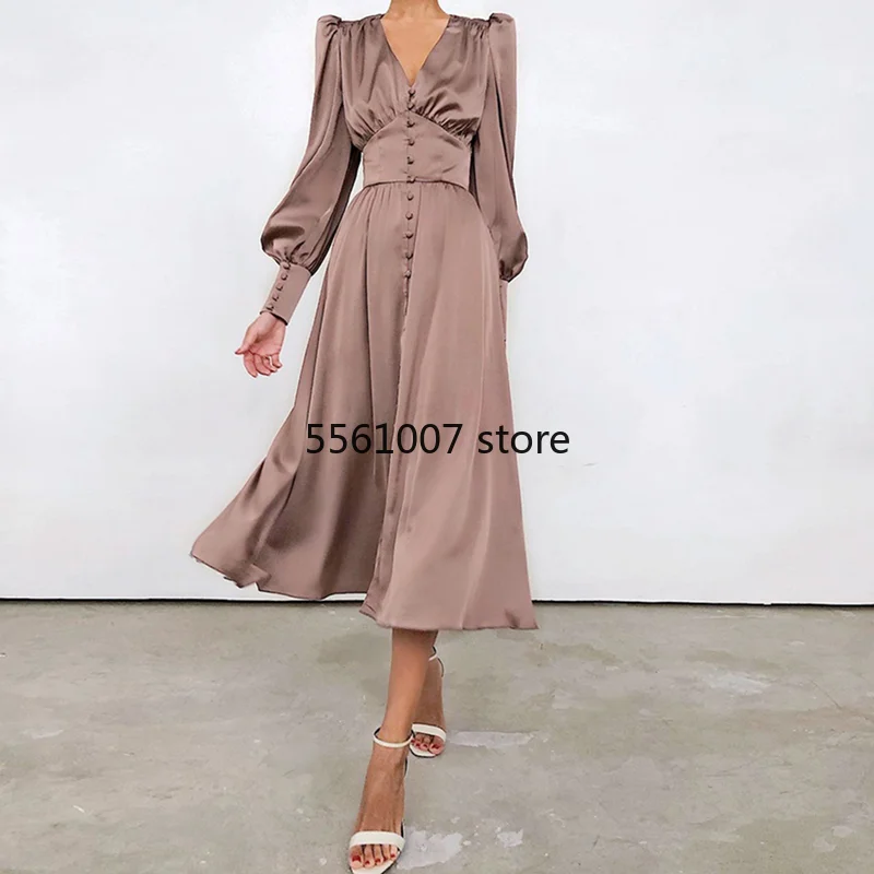 Женское однобортное атласное платье миди VestidosMujer, бежевое эле...