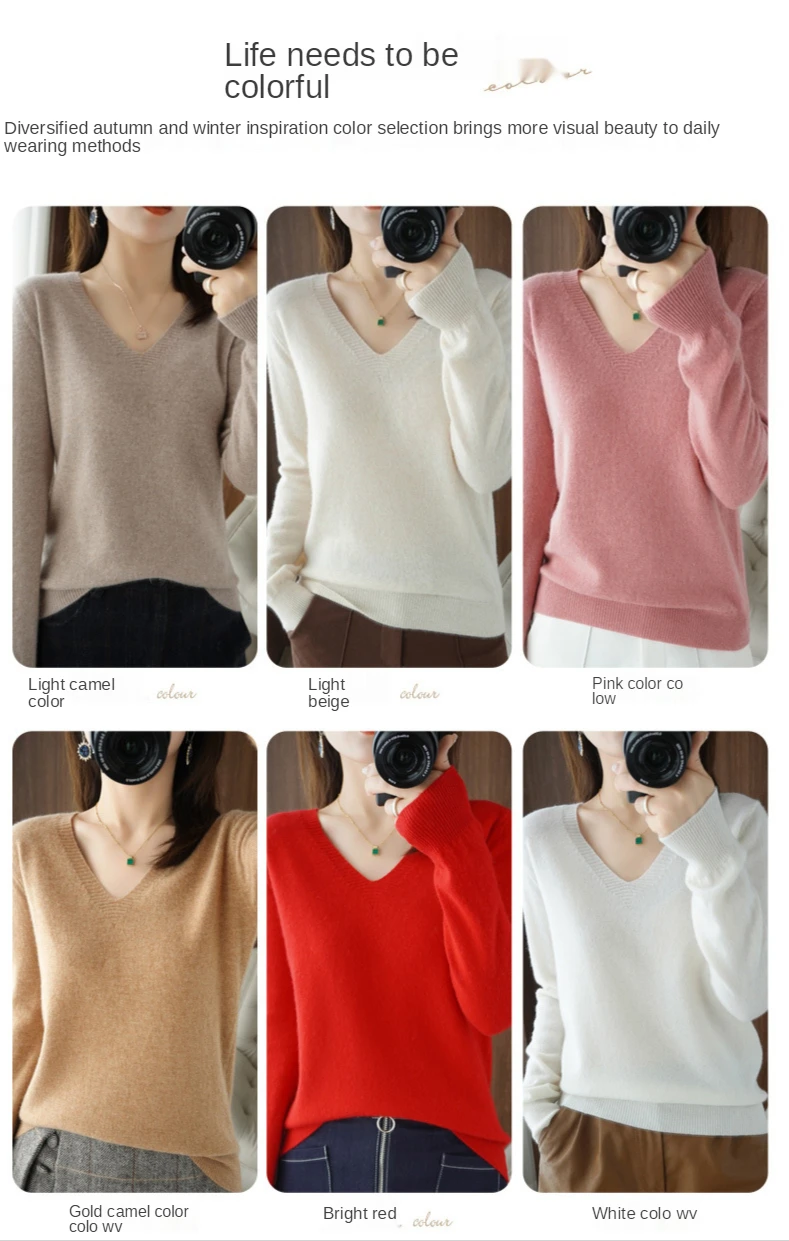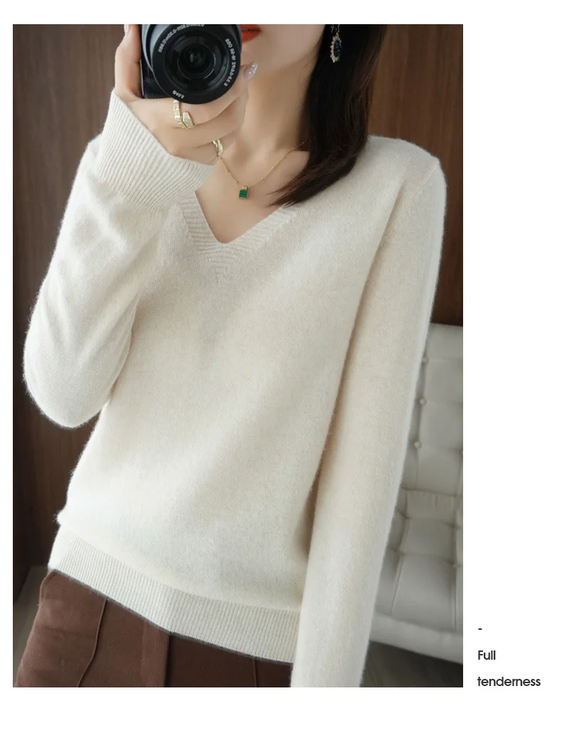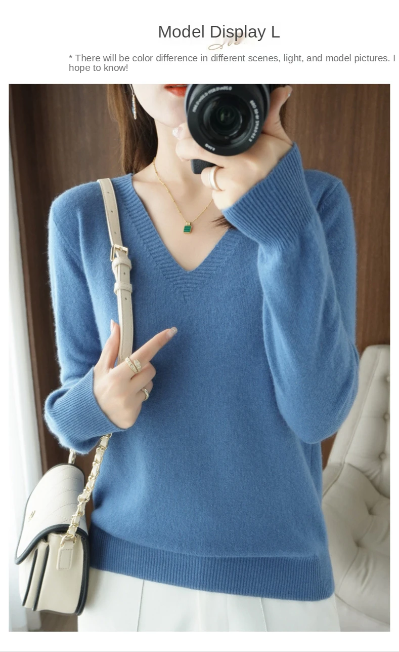 Женский кашемировый свитер с V-образным вырезом, теплый трикотажный...
