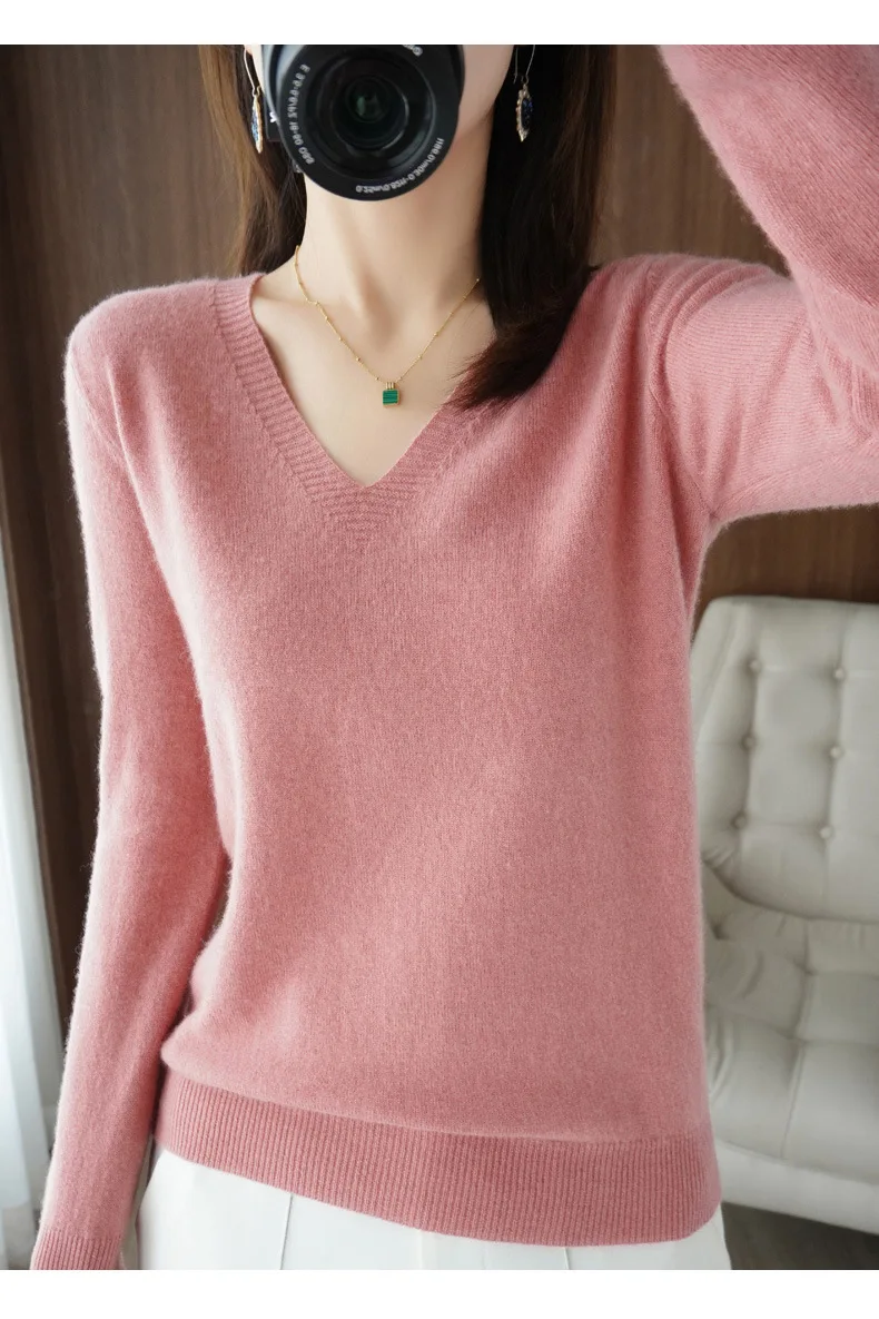 Женский свитер с V-образным вырезом, Розовый пуловер, Осень-зима 2021