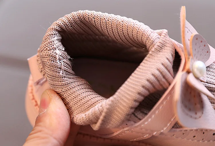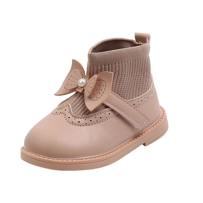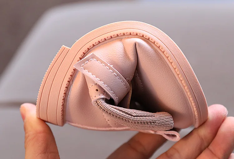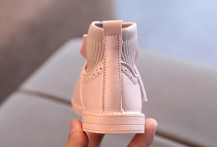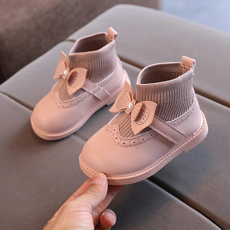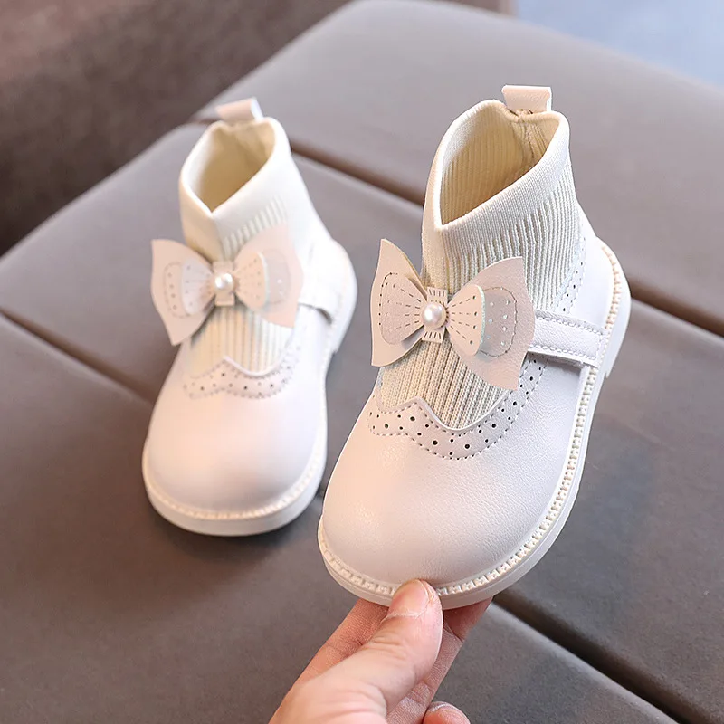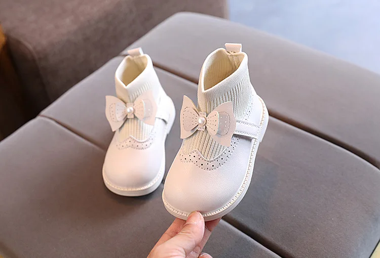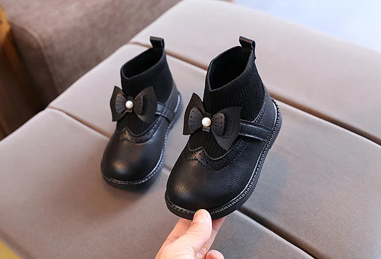 Новинка; Модные кожаные ботинки для девочек; Осенние детские короткие ботинки на мягкой подошве; Вязаная тонкая обувь с милым бантом; G265