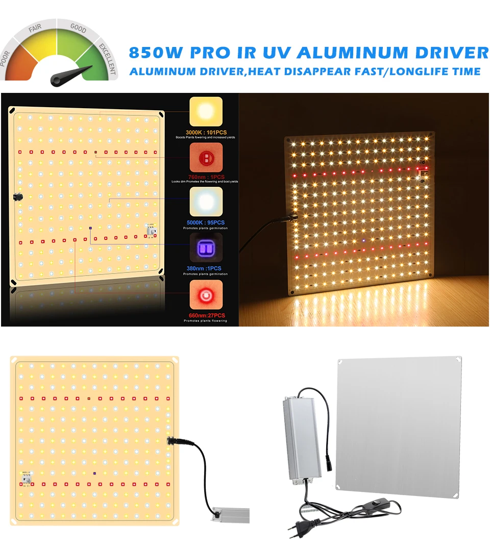 Спектр: 3000K + 5000K + 660NM + 730NM + 380NM 3000K: теплый белый 5000K: холодный белый 660нм: темно-красный 730 нм: инфракрасный 380нм: УФ Фактическая мощность: 65-70 Вт Комплект с водителем из водонепроницаемого алюминия