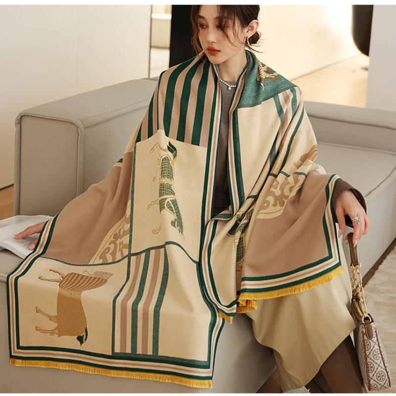 Шарф женский кашемировый, зимний, толстый, с принтом лошадей