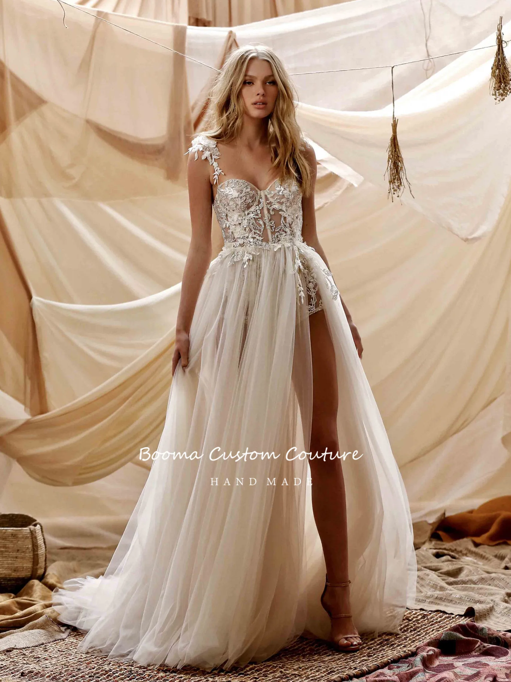 Сексуальные пляжные свадебные платья Booma с сердечком иллюзионные аппликации с высоким разрезом Бохо платья невесты с открытой спиной трапециевидные тюлевые свадебные платья
