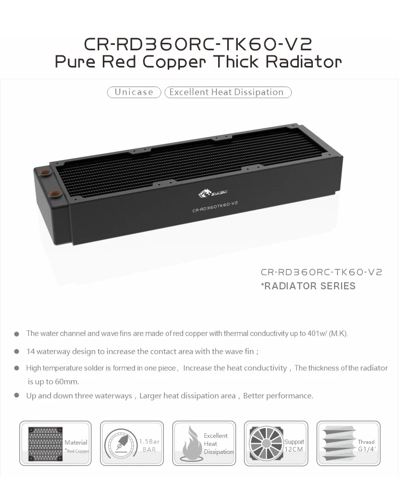 Радиатор для охлаждения ПК Bykski G14 дюйма, 60 мм, медный, с поддержкой вентилятора 12 см, 360 мм, CR-RD360RC-Tk60-V2