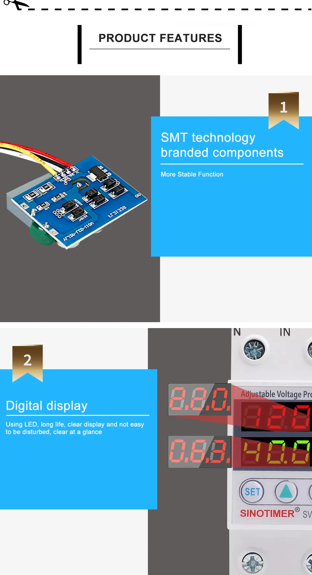 Его основная особенность заключается в том, что когда цепь имеет перенапряжение или Низковольтное напряжение, проблемы с током, продукт может немедленно отключить источник питания для защиты электрооборудования от повреждения, кроме того, протектор может автоматически включать источник питания, когда напряжение цепи возвращается к нормальному.