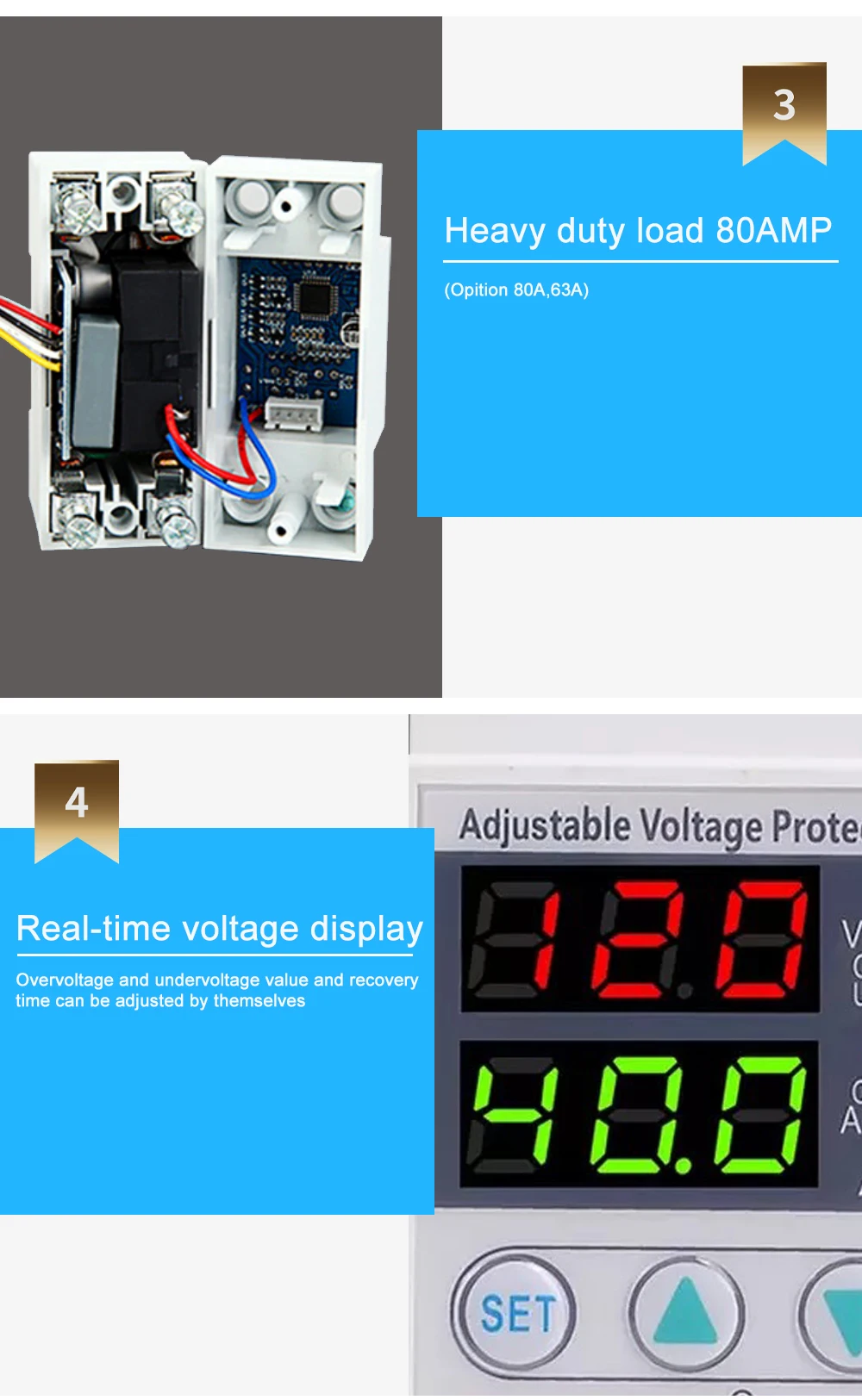 Реле превышения напряжения, 80 А, 63 А, 230 В, Din-рейка, регулируемое автоматическое устройство с двойным цифровым дисплеем, защита от предельного тока