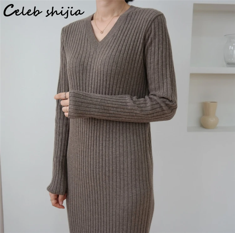 Осеннее вязаное платье SHIJIA абрикосового цвета, женское элегантно...
