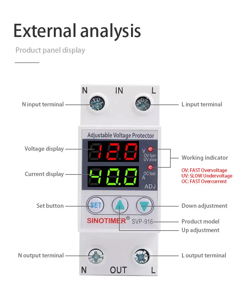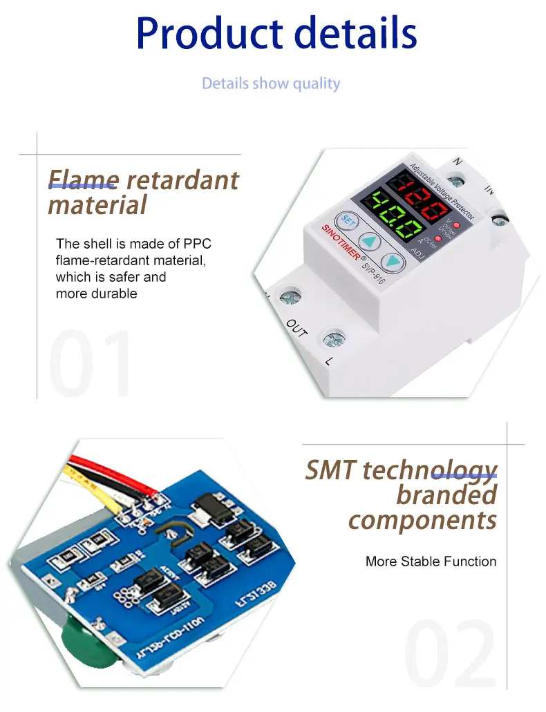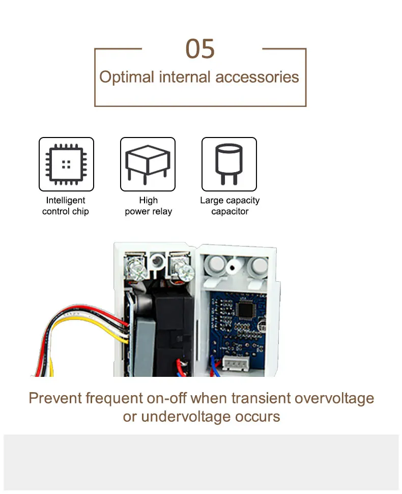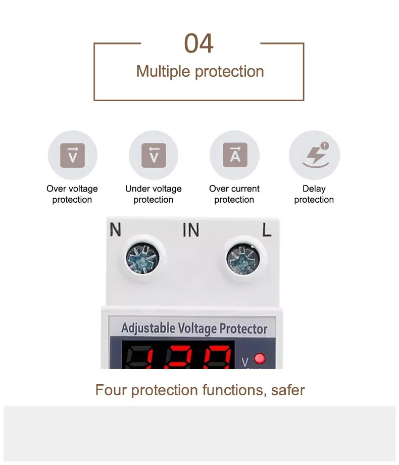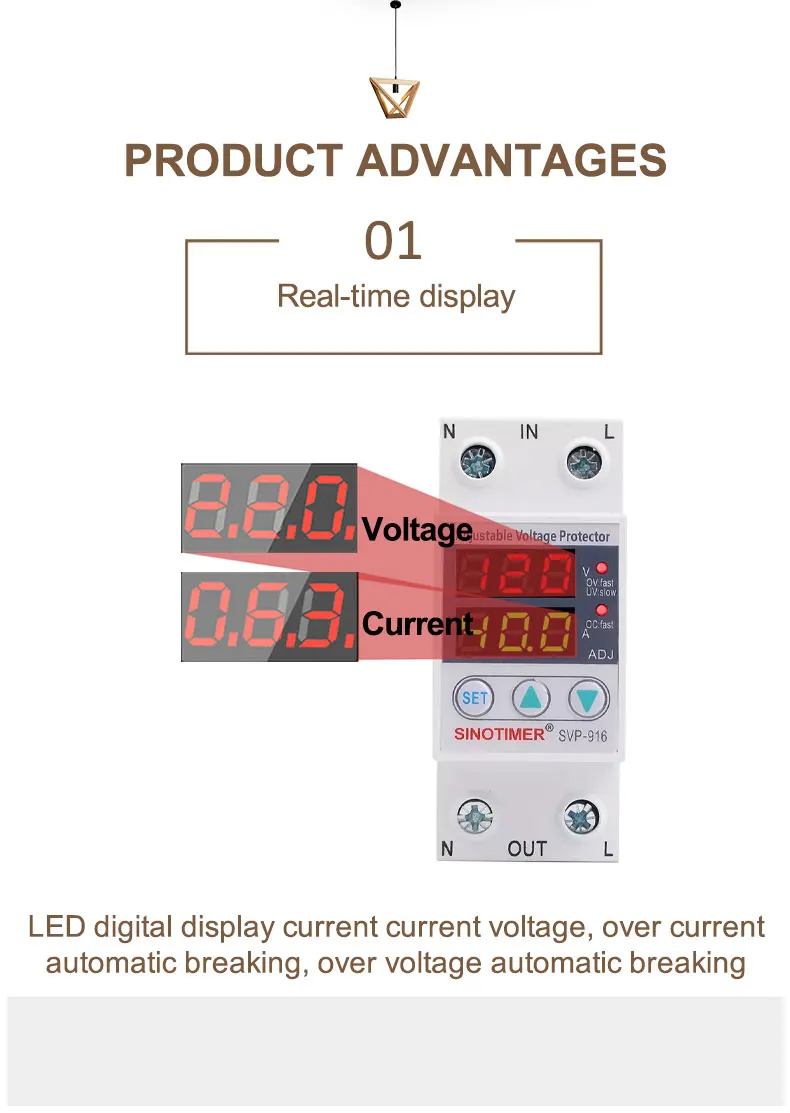 Его основная особенность заключается в том, что когда цепь имеет перенапряжение или Низковольтное напряжение, проблемы с током, продукт может немедленно отключить источник питания для защиты электрооборудования от повреждения, кроме того, протектор может автоматически включать источник питания, когда напряжение цепи возвращается к нормальному.