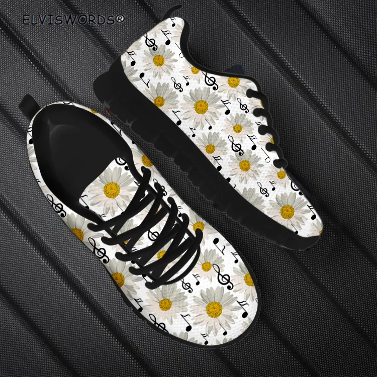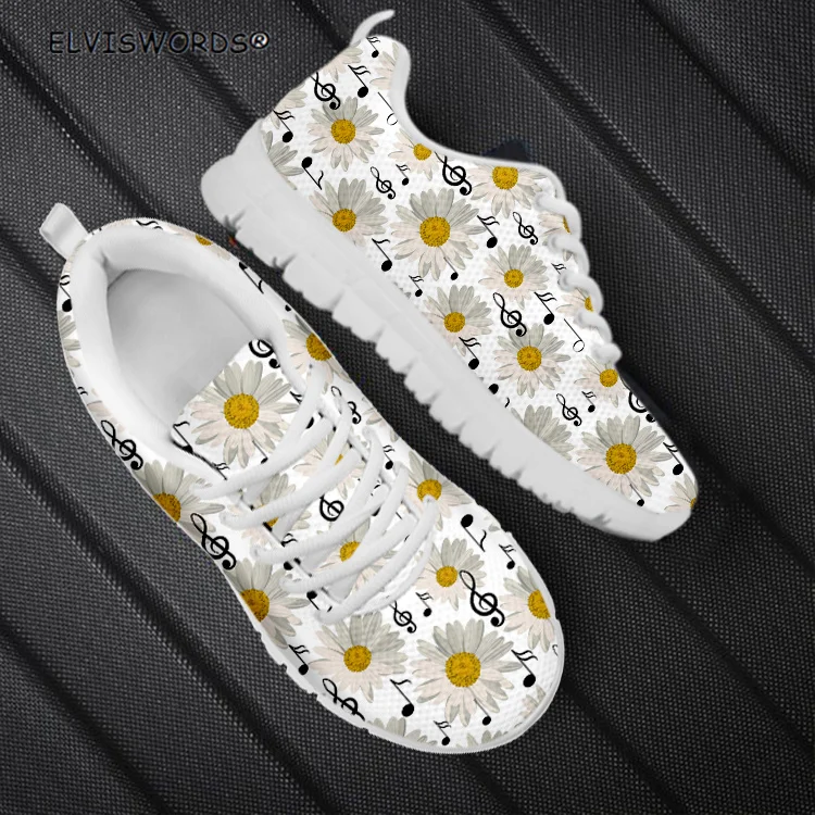 Женские дышащие кроссовки ELVISWORDS, с узором в виде музыкальных нот и белых маргариток, Дамская прогулочная обувь для отдыха