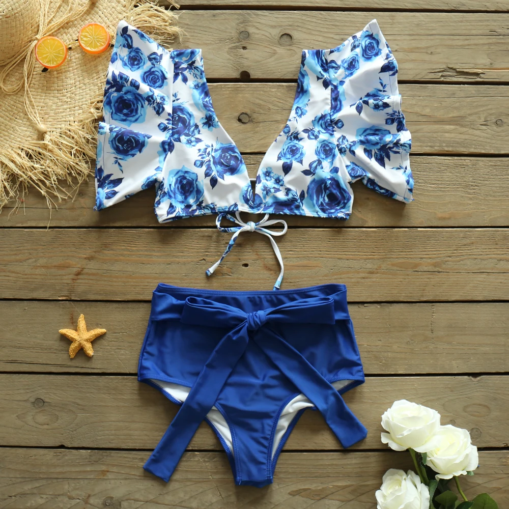 Женский купальник с воланом, с высокой талией и V-образным вырезом