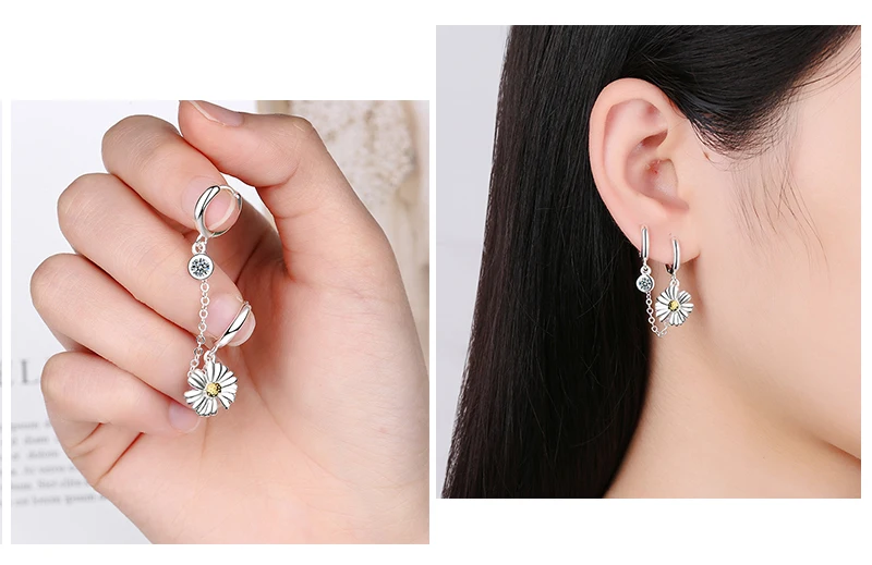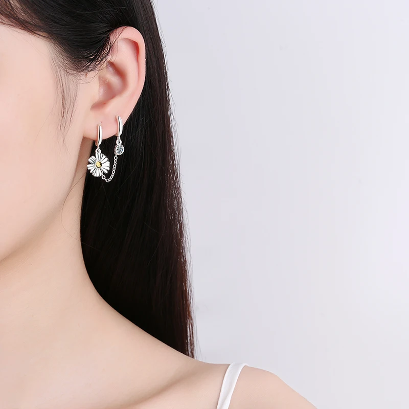 Оригинальные серьги из серебра 925 пробы с маргариткой, с двумя отв...