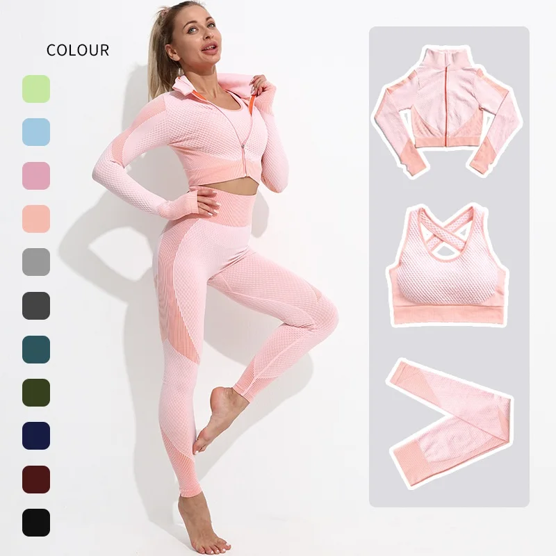 Бесшовный спортивный комплект из 3 предметов, женская одежда для бега, тренажерного зала, спортивный костюм, комплекты для йоги, леггинсы, бюстгальтер с высокой поддержкой, укороченный топ, одежда для тренировок