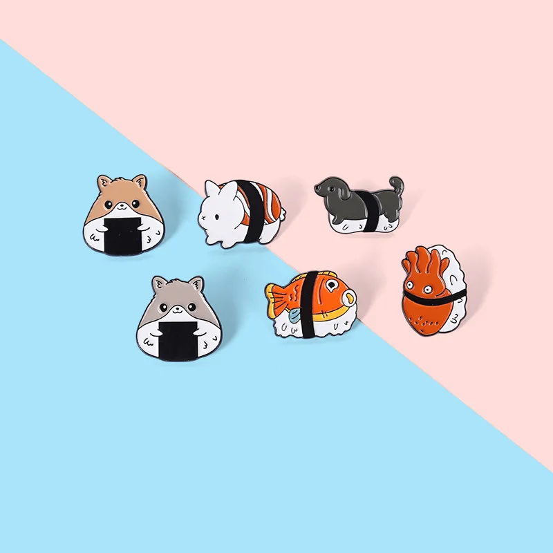 Эмалированная брошь в виде рисового шара, суши, кролика, таксы, рыб...
