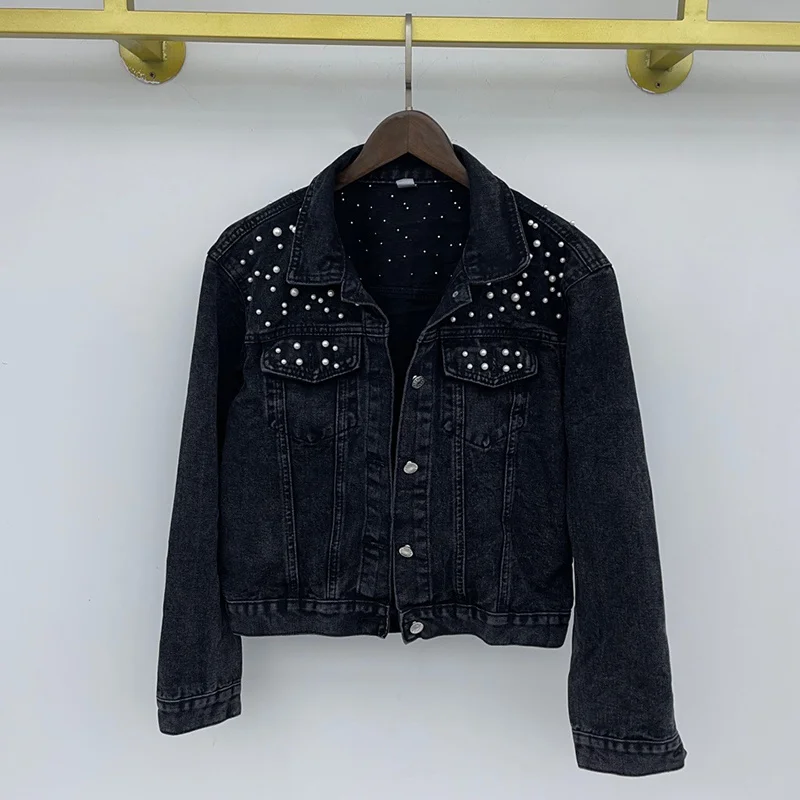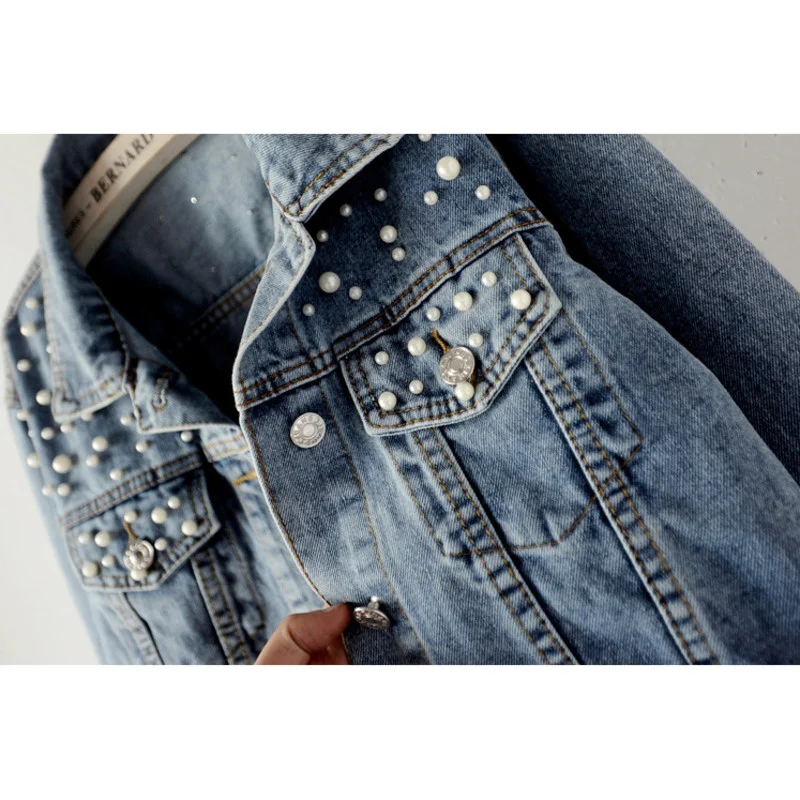 Модная женская джинсовая куртка, пальто, осень 2021, с жемчужинами и бусинами, с длинным рукавом, куртки, повседневные, свободные, на пуговицах, короткие джинсовые куртки размера плюс