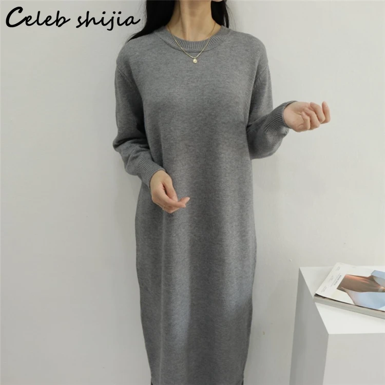 Новые осенние вязаные платья, женское серое Однотонное шерстяное пл...