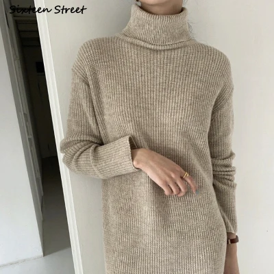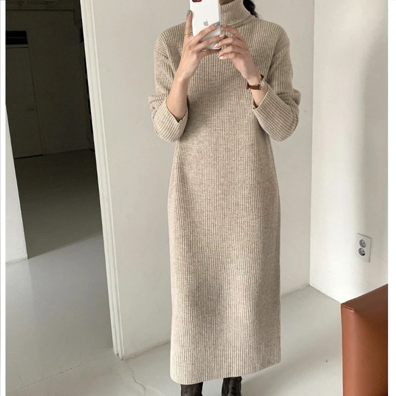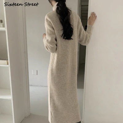 Винтажное шерстяное платье-макси, женское осеннее Новое свободное элегантное вязаное платье с высоким воротником, женский длинный свитер, зимняя одежда