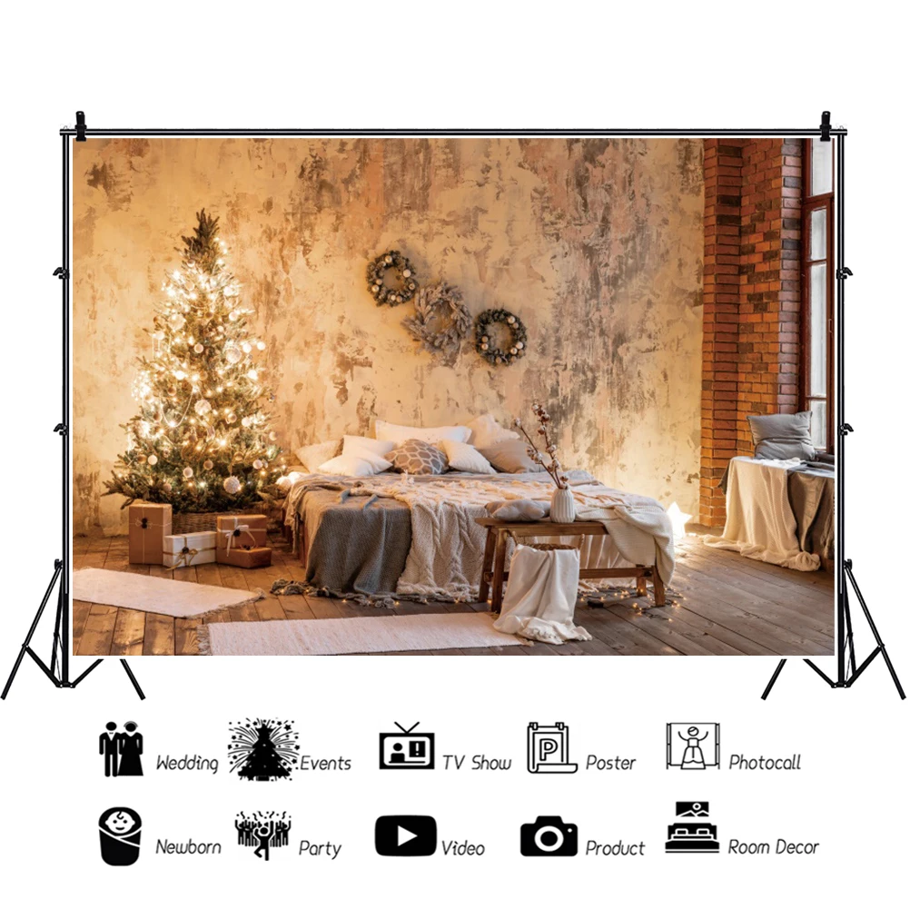 Рождественские фоны для фотосъемки спальня блестящая Рождественская елка подарки кровать старая цементная стена вечерние фото фон для фотостудии