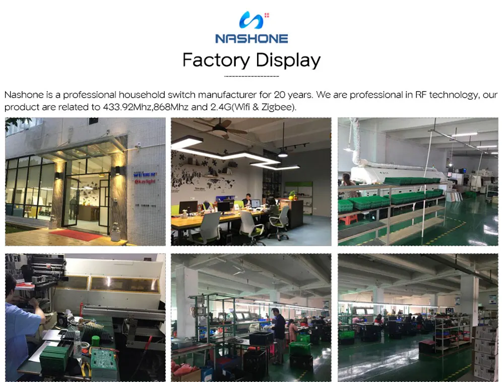 Nasone является профессиональным производителем бытовой выключатель в течение 20 лет. Мы являемся профессионалами в области радиочастотной технологии, наш продукт связан с 433,92 МГц, 868 МГц и 2,4G(Wifi и Zigbee).