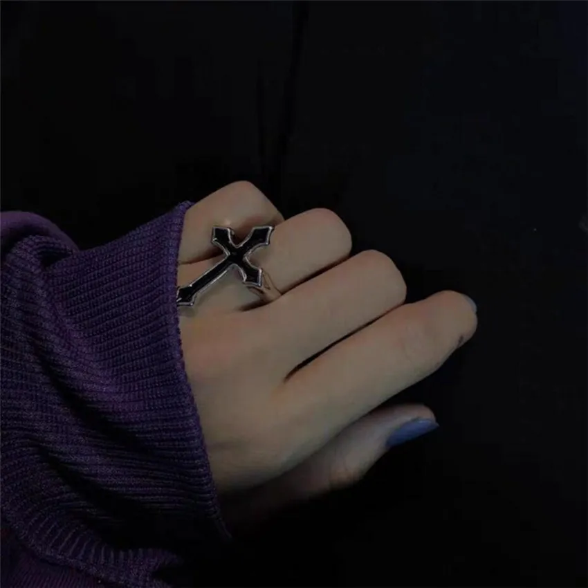 Открытое кольцо в европейском и американском стиле ретро с большим черным крестом, женская бижутерия для вечеринки, мужское модное готическое металлическое кольцо, кольцо в стиле хип-хоп