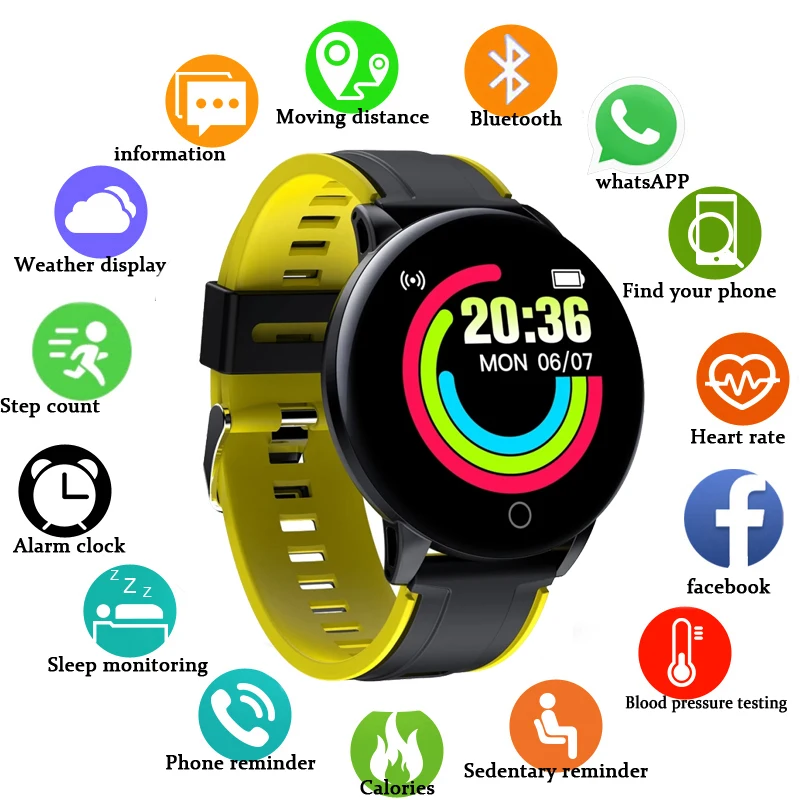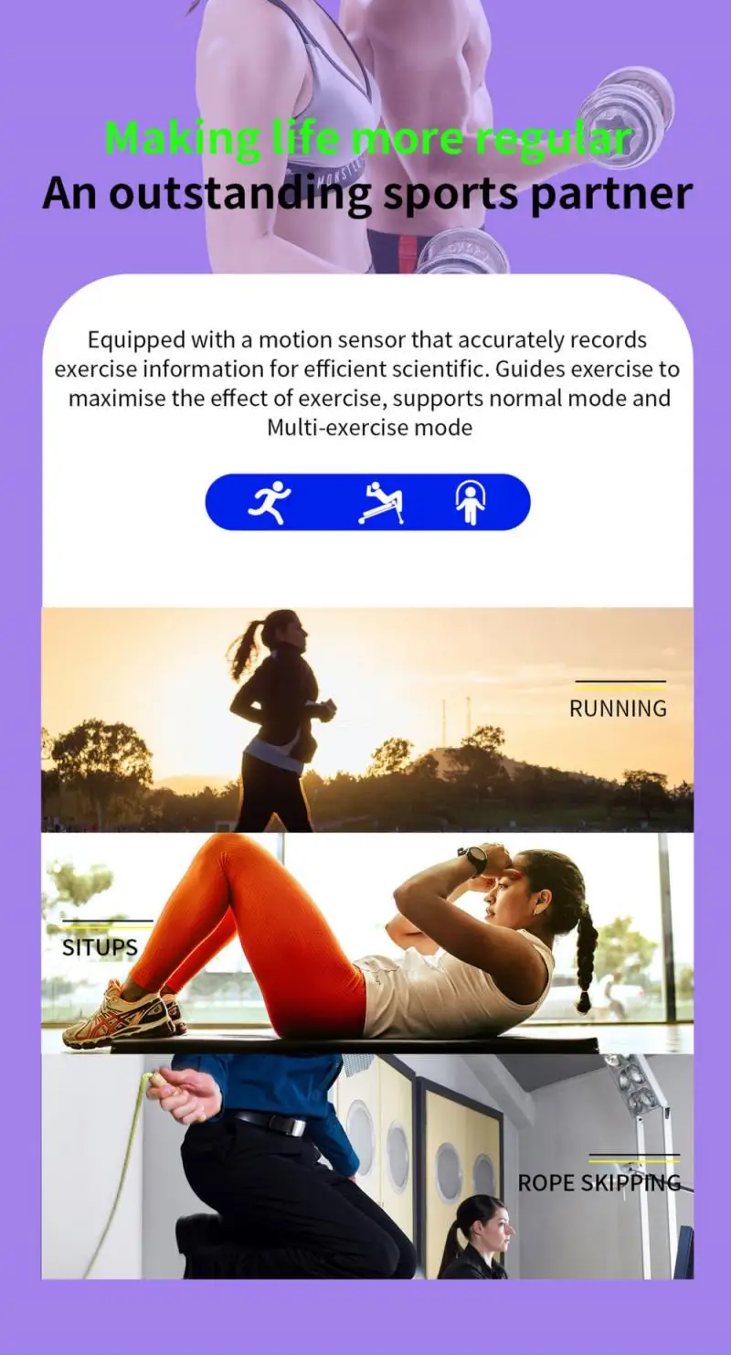 3.IP65 водонепроницаемый для повседневной жизни, мульти-спортивный режим, подходит для занятий спортом на открытом воздухе. Автоматически записывает ежедневный шаг движения и данные о калориях.