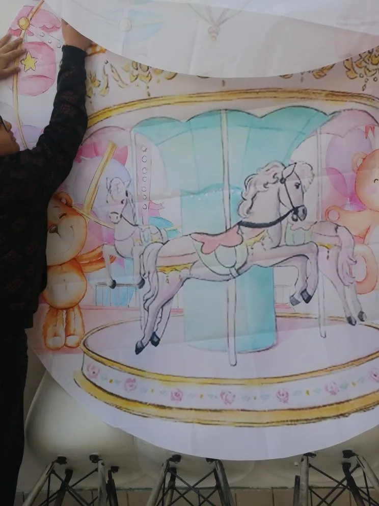 Фон для детских фотографий с изображением розовой карусели лошади медведя девочки цирковой карнавальный