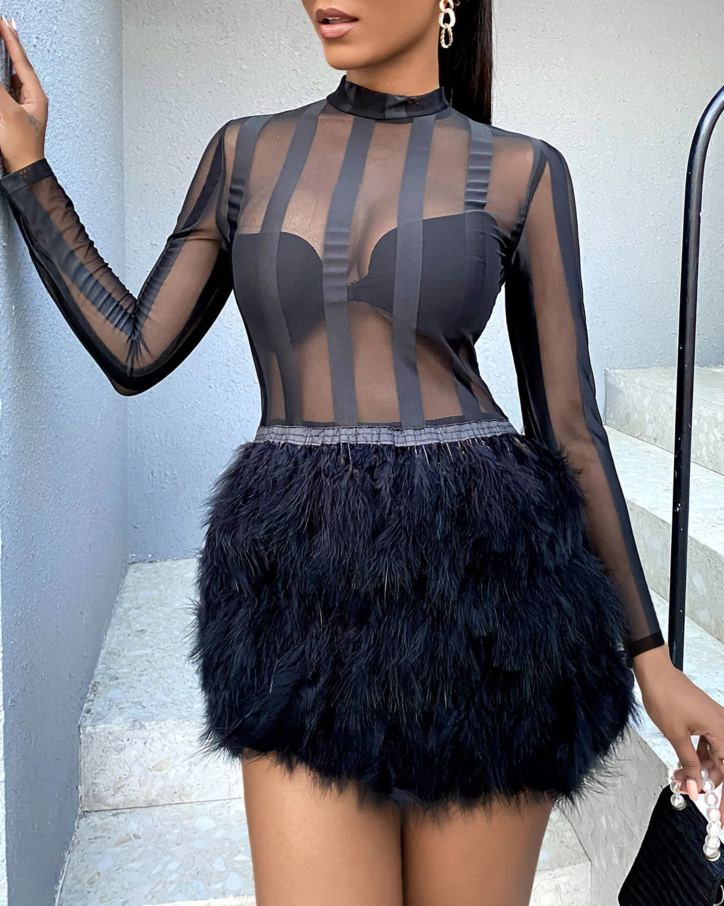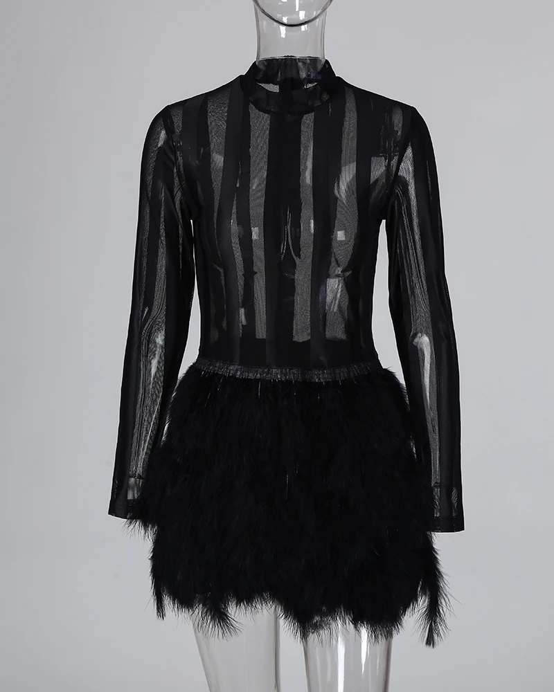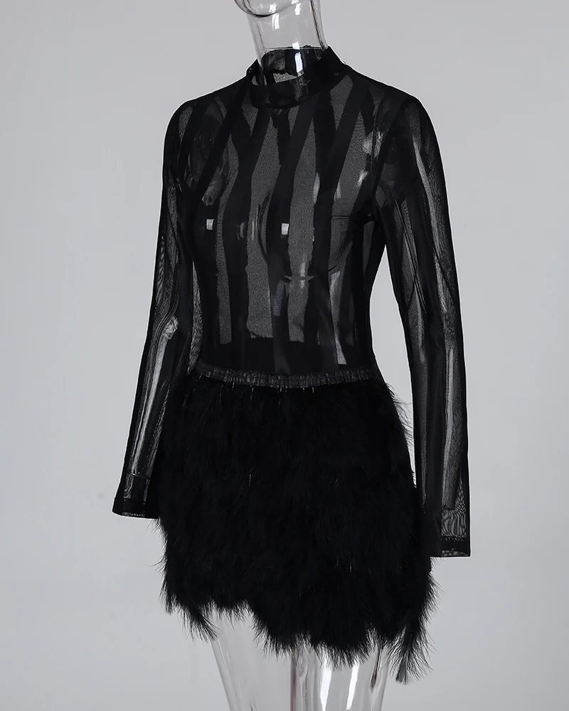 2021 женское элегантное платье с принтом волана шарфа на молнии дизайнерское прозрачное Сетчатое платье с длинным рукавом из искусственного меха