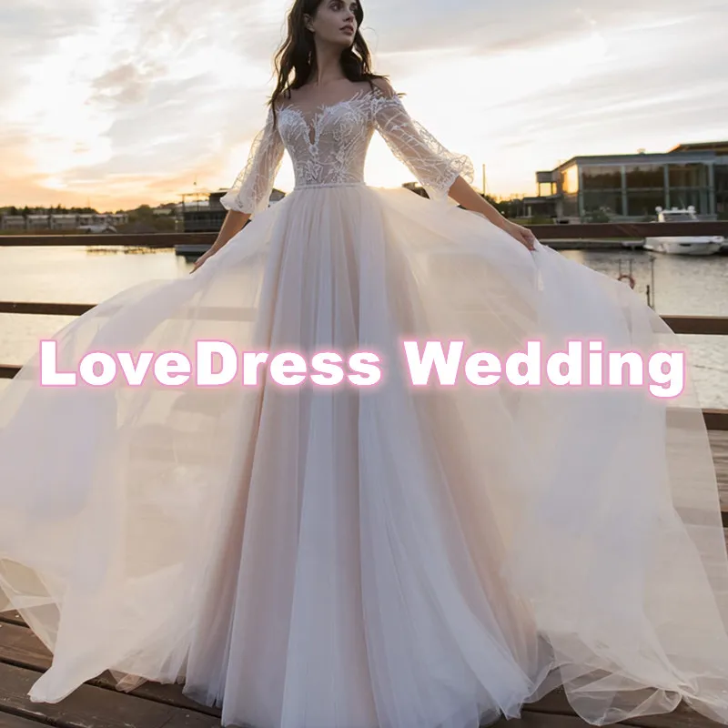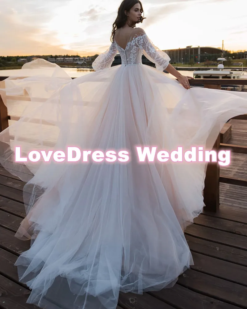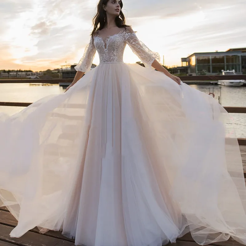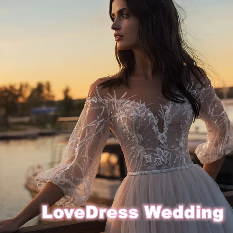 Элегантное свадебное платье с рукавом 3/4; Коллекция 2021 года; ТРАПЕЦИЕВИДНОЕ кружевное платье с круглым вырезом и аппликацией на пуговицах; Свадебные платья принцессы с открытой спиной из органзы; Vestido De Novia
