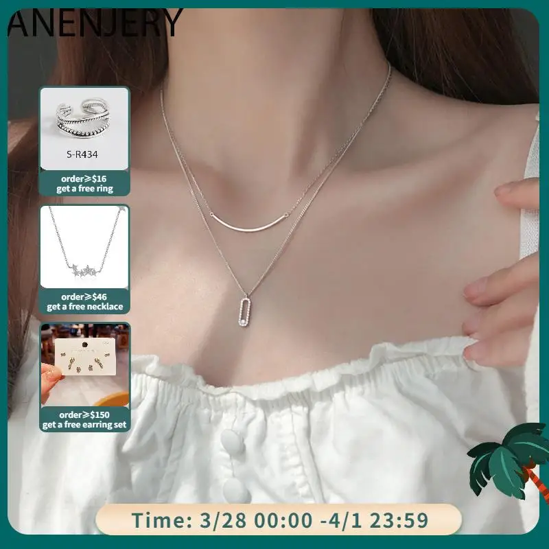 Женское Ожерелье с кулоном ANENJERY, серебряная медная микро-циркониевая изогнутая линия с геометрическим узором, двухслойная цепочка, простое ювелирное изделие