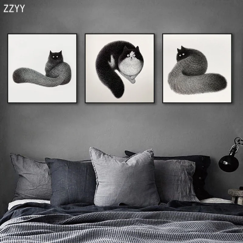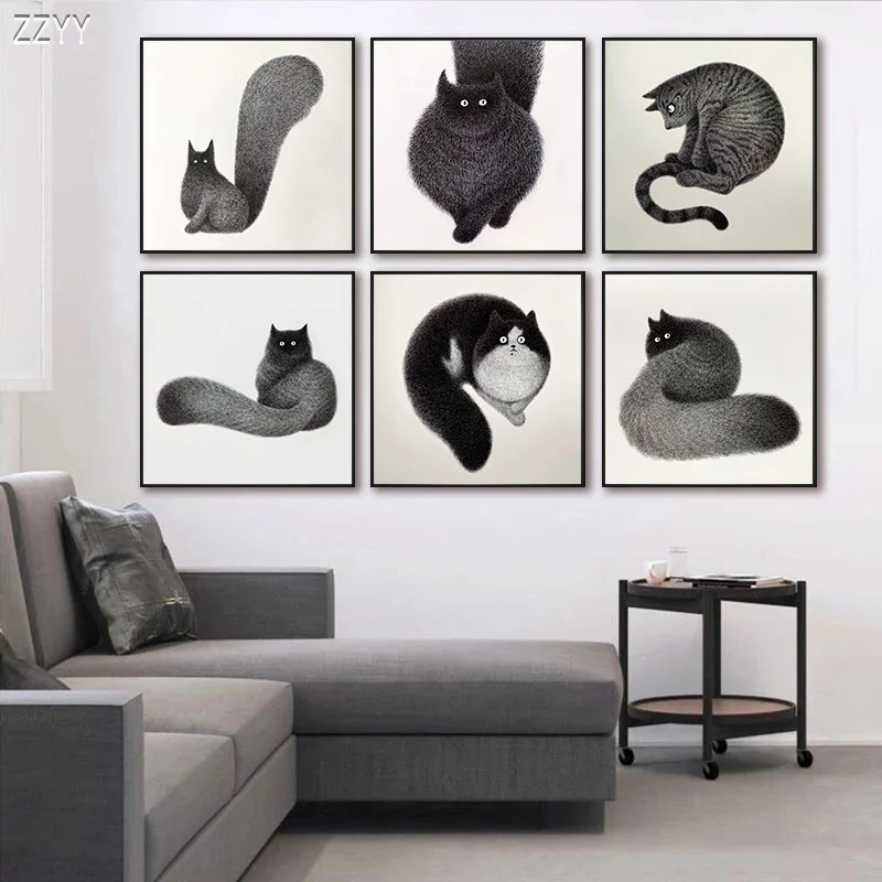 Черно-белая милая картина с изображением кошки на холсте плакат и печать чернильная картина кошка плакат и печать для гостиной домашний декор настенное искусство